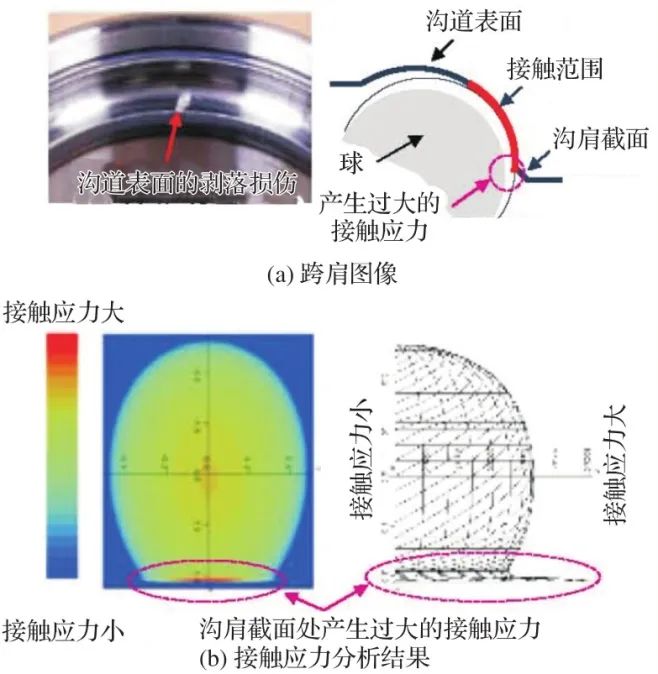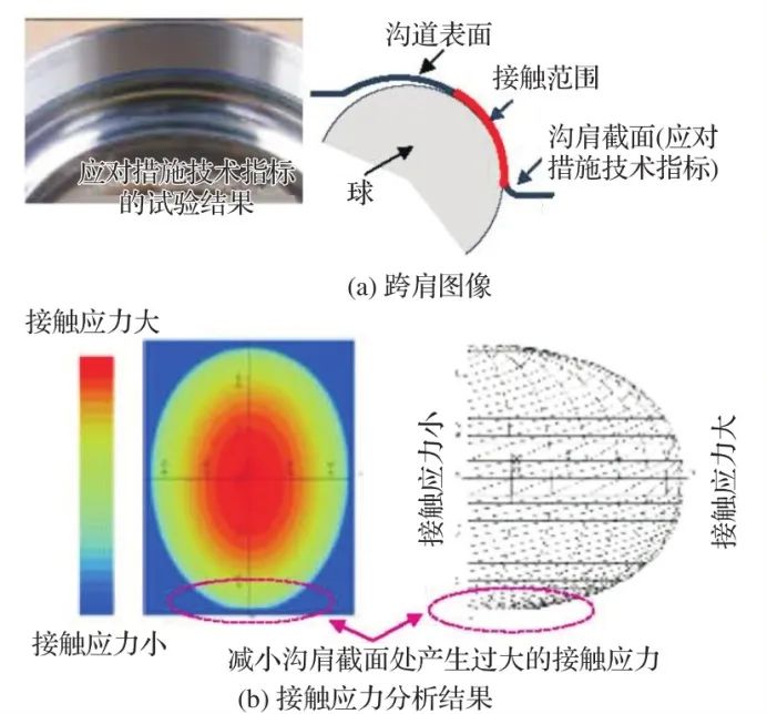 当输入较大载荷时,跨肩状态的示例如图3所示,其中球与沟道之间的接触范围超过沟肩,造成接触应力过大。根据车辆使用情况的不同,很难避免跨肩,因此需进行精确接触分析,以研究沟肩的最优形状。采取应对措施后的耐久性试验和接触应力分析的结果如图4所示。通过保持沟道表面肩部附近产生的接触应力较小,成功地防止了早期滚动疲劳损伤。