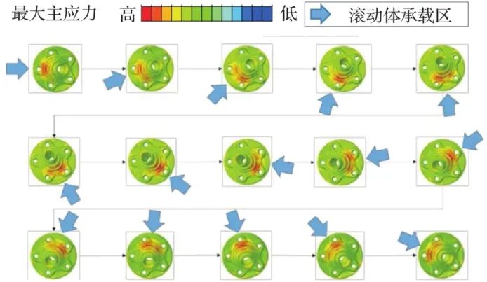 在各滚动体加载阶段,轮毂凸缘的最大主应力分布如图13所示。除了具有装配车轮和制动器的功能外,为保证减重和刚度等性能,每辆车的轮毂凸缘形状不同。因此,每种模型的最薄弱部分不同,需综合考虑强度来输入旋转载荷。