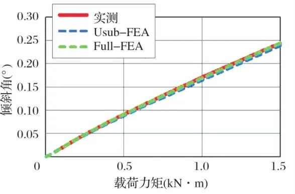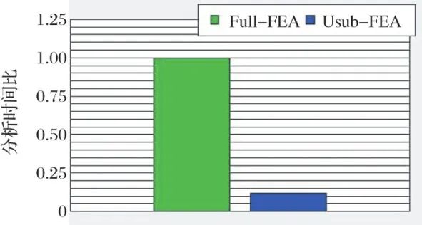 刚度预测值与实测值的对比如图7所示。由Full-FEA和Usub-FEA分析得到的预测值与实测值趋于一致,具有足够的精度。Full-FEA在滚道表面有许多传输接触载荷的节点。该方法具有高的接触刚度和高的滚道表面变形重现性,且有精度略高于Usub-FEA的趋势。2种分析方法计算时间的对比如图8所示。由于无需减小Usub-FEA的网格尺寸来模拟接触状态,因此可成功地减小模型规模,从而在保持分析精度的同时显著减少计算时间。