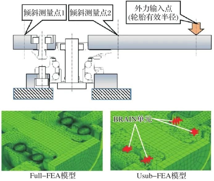 轮毂轴承单元支承着由车辆质量和转弯等运动产生的惯性力,变形(刚度)的大小是影响车辆动力学性能的重要因素。将变形分为三类:1)轮毂轴(包括轮毂凸缘)的变形;2)滚动体与套圈之间的接触变形;3)外圈凸缘的变形。把各面排列成一个序列,使其相互依赖,并且具有包括接触在内的非线性载荷位移特性。采用非线性FEA对该刚度进行预测,并采用Abaqus作为分析软件。刚度评估试验示意图和分析模型示例如图6所示。轮毂凸缘和加载夹具、外圈凸缘和固定夹具分别用螺栓紧固。等速节也用螺母紧固。为了简化分析,未对螺栓的螺纹部分和等速节进行建模,但施加一个压缩载荷作为紧固轴向力。由于滚动体与套圈之间的接触面积很小,为了采用FEA进行精确计算,必须使网格尺寸足够小,这需要大规模且耗时的计算。在这种情况下,分析方法是Full-FEA。一般认为,滚动体(球面)与套圈(曲面)之间的接触处于规定的Hertz接触状态。此外,当对轮毂轴承单元施加载荷时,由于滚动体与滚道表面之间接触角的变化以及承载区范围的变化,刚度变得复杂且非线性。因此,将最初由NSK基于Hertz接触理论开发的BRAIN (Bearing Analysis In NSK)软件作为用户子程序集成到Abaqus中,消除了对接触部分进行精细网格划分的需要,这是Full-FEA所必不可少的。同时,构建了一种能考虑高精度非线性刚度的耦合分析方法,该方法被称为Usub-FEA。