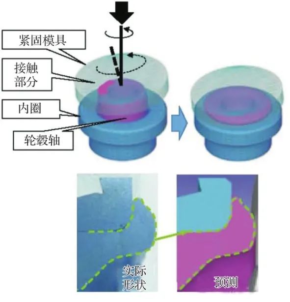 用于确定摇辗紧固后的形状和残余应力的弹塑性FEA的示例如图5所示。在分析中采用了Deform,其在紧固模具操作条件设置和大规模塑性变形分析方面非常出色。得到的紧固面形状预测的高精度也如图5所示。分析中输入的加工条件反映了采用实际制造设备的加工载荷测量结果。此外,从各种材料试验中提取了诸如应力-应变曲线等材料特性。由分析结果可得加工后的强度(硬度)和残余应力,因此可预测车辆在运行过程中的疲劳强度。采用该方法可使以往依赖简单分析方法和实际机械试错的紧固面设计更有效。