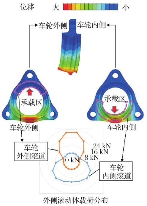 压痕重现试验的示意图如图9所示。采用圆度测量仪测量带有压痕的滚道表面状态(图10),表明了车轮外侧滚道与内侧滚道之间压痕的范围和深度不同。假定当施加过大的载荷时,各零件的变形影响压痕形成,因此采用Full-FEA方法计算滚动体载荷分布。车轮外侧滚道与内侧滚道之间滚动体载荷分布以及外圈变形对比如图11所示。在车轮内侧滚道中,滚动体承载区与套圈刚度较小的范围重叠,滚道表面变为椭圆形。可假设由于套圈变形,压痕数量随着承载区变宽而增加。由该结果发现采用Full-FEA可实现基于抗压痕能力的套圈厚度优化设计。