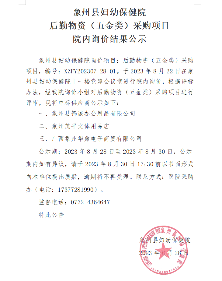 象州县妇幼保健院后勤物资(五金类)采购项目院内询价结果公示