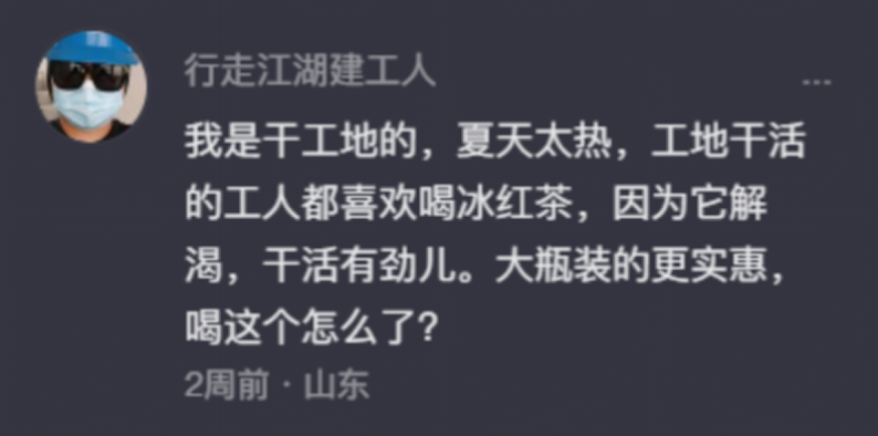 但对于需要即时解暑、补充水分、补充糖分的体力工作者来说,却是性价比极高的选择。曾有人总结过爱买冰红茶的的几类群体:需要提振精神的体力劳动者、运动量较高的大学生、去网吧上网的年轻人……而这几个群体的共同点,无一例外是手头拮据、生活费有限,和短视频里那些动辄住大别墅、开阿尔法罗密欧的有钱人完全分道扬镳。与社交平台里极致张扬的富家生活方式相比,一桶简单的冰红茶,虽然不能获得流量,但可以让人获得精神上的慰藉。在网吧上网,往往是意志与膀胱的决斗,是手速与时间的赛跑,屁股一沾座椅,往往是8小时起步。而1L装的冰红茶,显然略去了反复起身买水的过程,让诸位同学在赛博世界里,更加持久。死磕学习,为考试不挂科而奋斗时,更少不了冰红茶的加持。之前B站有个Up主叫向前的赵,曾经在视频中吐槽考试周时间安排太紧,突然冰红茶入镜,引得大家集体共鸣。在图书馆与寝室的书桌上,冰红茶内含咖啡因,不仅解渴还能提神,为学生们后半夜的拼搏,提供了充足的精神弹药。除了学生外,冰红茶最忠实的粉丝无疑是广大劳动者,这其中以建筑工人最有代表性。他们在烈日下工作,收入有限,严苛的环境也摧残着他们的身体。如果说冰美式是格子间女工的机油,那么高油高盐的“重口味”饭菜配一大瓶冰红茶,就是建筑工人们的加油站。一位专门记录自己在工地三餐的博主@DD小水,常常在下工以后用一句再见告别工地,用一瓶冰红茶开启自己的工闲时光。在过去,骆驼祥子拉完车以后,吃一碗卤煮炸豆腐攒劲;在现代,工地上累死累活的牛马们,喝一瓶冰红茶入魂。而在塔吊上的工人,因为长时间在高空作业,也经常会用1L装的冰红茶饮料瓶解决上厕所问题。由此还引发一则都市传说,“塔吊下的冰红茶不能捡”。2020年冰红茶终端销售网点多达400万个。无论你在川西高原,途径天空之城理塘,还是在山东爬泰山,三亚吹海风,只要乐意就能喝到。时至如今,这个品类仍然是统一和康师傅两家公司的支柱产品之一。好喝,便宜,好买,这三股力量形成一股合力,让冰红茶成为了饮料界当之无愧的王者。与其说网友们在捍卫喝大桶冰红茶“权利”,不如他们在缅怀一种正在渐渐消失的、易得的快乐。事实上,即使是如今会在逛超市时径直走向无糖饮料的年轻人,大概率也是喝着冰红茶长大的。这毫无疑问是一款国民级饮品。中国人(尤其是80后90后)对冰红茶的接受程度,与可乐难分伯仲。有趣的是,冰红茶的历史其实跟中国互联网的历史差不多悠久。统一冰红茶诞生于1995年6月,一年之后为了竞争统一的软饮市场,康师傅冰红茶也随之上市。而一个月之后,1996年11月15日,实华开公司在北京首都体育馆旁边开设了实华开网络咖啡屋,这也是中国第一家具有商业意义的网吧。但冰红茶真正火起来是2003年。伴随着中国大陆的彩电、计算机、拨号网络价格的日渐亲民化,彩色数字广告也开始攻占老百姓的心智。小孩子、年轻人开始上网冲浪,一家子围坐在电视前看《幸运52》、《快乐大本营》,两家做冰红茶的公司也不约而同地推出了广告轰炸战略。统一公司请出了当时仅有24岁的热门歌手孙燕姿,喊出了“年轻无极限”的口号。还举办了2003、2004全国大学生“统一冰红茶”歌手大赛。张靓颖是2004年的总决赛冠军,比她去参加超级女声还早了一年。康师傅更是直接请了李宗盛和任贤齐来办综艺,当时李宗盛和任贤齐刚好在扶持乐队五月天,于是把五月天也拉了进来。2003年9月,“康师傅”冰红茶冰力先锋乐队选拔赛如期召开。选拔赛上,任贤齐和五月天一起唱了一首《冰力十足》。歌曲十分具有动感,即使现在听歌词,也能感受到一丝凉意。两家饮品巨头相互竞争的同时,间接推动了流行文化的繁荣。也把冰红茶这个品类变成了一代人的集体记忆——我们似乎都默认了一个不成文的事实,夏天就得喝冰红茶。喝了冰红茶就能玩摇滚、玩滑板,打篮球怎么打都不嫌累。当网吧的网费降到2元一小时的时候,冰红茶也开始成了网吧的必需品。一个写着“再来一瓶”的瓶盖,可以让当时还在上学的90后开心整整一个下午。而这么多年过去,很多东西都变了,但冰红茶依然还是小瓶三块、大瓶四块。那是一个个与冰红茶有关的夏日,一如2023年的这个夏日一样,温度没有区别。近年来无糖茶饮声势越来越浩大,也侵蚀着冷饮柜的空间。康师傅和统一都试图推出自己的无糖冰红茶,但是销量并不是很好。因为大部分消费者对冰红茶的认知,就是充满糖度的,是以前暑假喝一口就能活力满满的。怀念的是小时候吃点白砂糖就会开心许久,可现在追问一个年轻人如何让他们开心,或者上次最纯粹的开心是什么时候,他们解答不了这个难题。喝下第10万口冰红茶的时候,我们发现了,它不仅没有那么冰力十足、无可替代了,而我们的年轻是有极限的。“那么多糖,我会变胖脱发吧?”“我是不是要喝更提神的红牛来应付工作?”“等等客户过来我不应该在桌上放瓶冰红茶吧,赶紧买两杯星巴克”。我们沉默地领悟了,哦这第10万口,名为生活的本质。像一本疯狂的书籍《工业社会及其未来》所说的那样,世界上第一辆汽车出现的时候,人类获得了自由,可以无拘无束地驰骋。但当第10万辆汽车出现的时候,人类获得了枷锁,枷锁名为交规、空气污染、事故……可当冰红茶带上了“土狗饮料”的