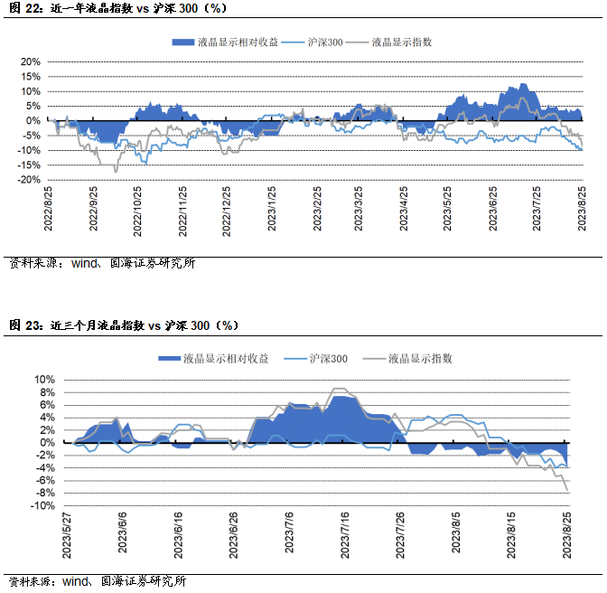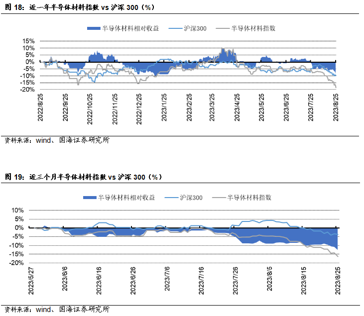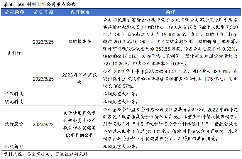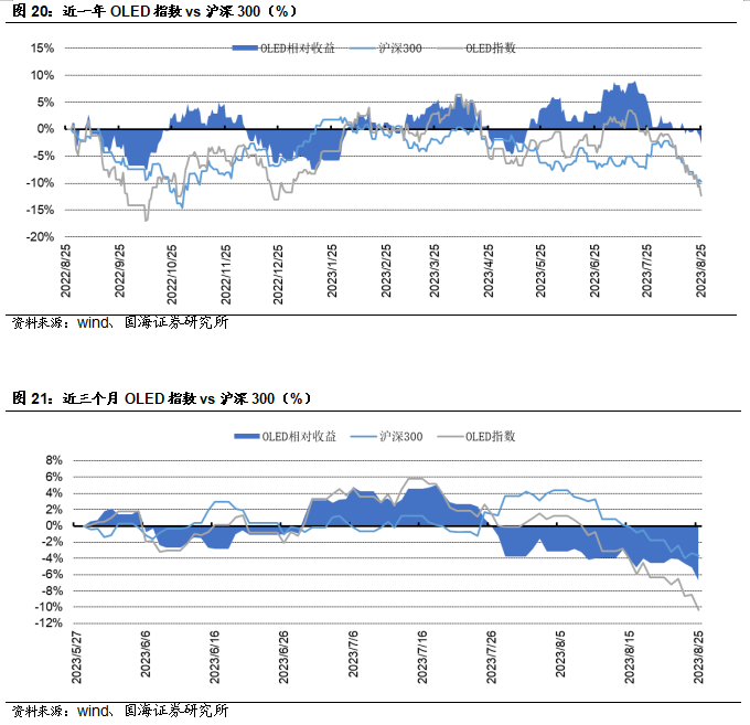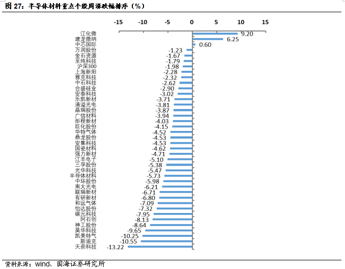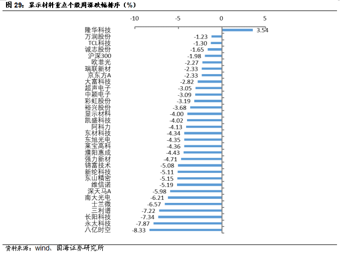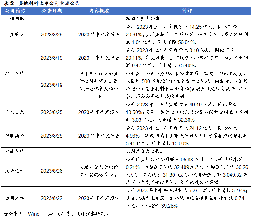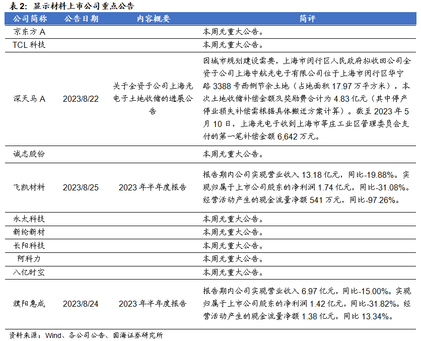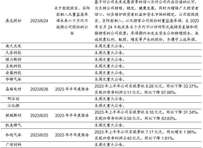 福斯特:8月25日,公司发布公告称,2023年上半年,公司实现营业收入106.16亿元,同比+17.76%。实现归属于上市公司股东的净利润8.85亿元,同比-16.31%。经营活动产生的现金流量净额-18.90亿元。天赐材料: 8月23日,公司发布公告称,年产15.2 万吨锂电新材料项目为公司2022年公开发行可转换公司债券募投项目,该项目中年产15万吨液体六氟磷酸锂产线装置已于 7 月底完成安装并调试成功,并于近日开始进料试生产,目前已连续产出三批合格产品,产品质量均符合公司电解液生产要求。万盛股份:8月26日,公司发布公告称,公司2023年上半年实现营收14.25亿元,同比下降20.61%;实现归属于上市股东的扣除非经常性损益的净利润1.01亿元,同比下降56.81%。中航高科:8月25日,公司发布公告称,公司2023年上半年实现营收24.12亿元,同比增长4.93%;实现归属于上市股东的扣除非经常损益的净利润5.41亿元,同比增长15.00%。本周半导体指数较上周下跌5.73%,跑输同期沪深300指数3.75个百分点。OLED指数较上周下跌4.34%,跑输同期沪深300指数2.36个百分点。风险提示:替代技术出现;行业竞争加剧;经济大幅下行;产品价格大幅波动;重点关注公司业绩不达预期等。