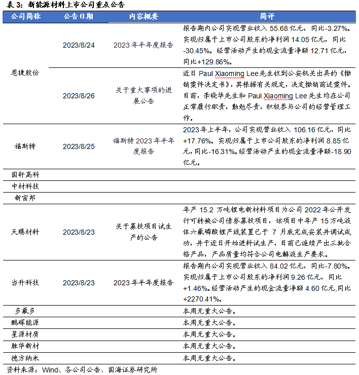 深天马A:8月22日,公司发布公告称,因城市规划建设需要,上海市闵行区人民政府拟收回公司全资子公司上海中航光电子有限公司位于上海市闵行区华宁路3388号西侧节余土地(占地面积17.97万平方米),本次土地收储补偿金额及奖励费合计为4.83亿元(其中停产停业损失补偿需根据具体搬迁方案计算)。截至2023年5月10日,上海光电子收到上海市莘庄工业区管理委员会支付的第一笔补偿金额6,642万元。濮阳惠成:8月24日,公司发布公告称,报告期内公司实现营业收入6.97亿元,同比-15.00%。实现归属于上市公司股东的净利润1.42亿元,同比-31.82%。经营活动产生的现金流量净额1.38亿元,同比13.34%。8月23日,中国光伏行业协会:根据中国光伏行业协会对掌握的企业样本数据统计,2023年7月,太阳能级多晶硅产量环比下降8.1%,同比增长3.5%;硅片产量环比增长5.8%,同比增长52.8%,其中单晶硅片产量占比约99.3%;电池片产量环比增加9.4%,同比增长38.5%,其中单晶电池片产量占比约98.4%;组件产量环比增加8.6%,同比增长68.8%,其中单晶组件产量占比约99.7%;逆变器产量环比增加0.9%,同比增长59.7%。8月25日,高工锂电:近期,上海、福建、浙江、广东等地密集公布包括锂电池、电动汽车、太阳能电池在内的产品出口数据。福州海关数据显示,今年上半年,福建省锂电池出口570.7亿元,同比增长 110.7%,在欧盟、东盟等地区实现了两位数以上增长;上海海关数据显示,上海口岸今年上半年锂电池出口475亿元,同比增长 60.9%。根据海关总署最新的数据,今年前7个月,我国锂电池出口总额同比增长58.9%。中国锂电池出口份额不断扩大,也说明中国锂电企业加速出海布局抢夺全球锂电市场份额。截至目前,已有宁德时代、中创新航、蜂巢能源、国轩高科、远景动力、亿纬锂能、欣旺达等超十家锂电巨头奔赴海外投资建厂。8月25日,北极星电池网:当升科技近期在接受调研时表示,目前国内固态电解质侧重于氧化物体系,日韩侧重于硫化物体系。公司在电池材料产品性能、制造技术、品质管理、市场开拓和供应链管理等方面具有突出综合优势,已系统布局氧化物、硫化物、聚合物等主流固态电解质技术路线。同时,公司固态锂电正极材料主要性能优势在于安全性更高、界面稳定性更好、表面锂离子扩散速率更快,性能领先于同行业竞争对手,超高镍材料已批量导入主要固态电池客户。未来,公司会根据市场情况和客户需求持续推进固态锂电材料生产及销售。恩捷股份:8月24日,公司发布公告称,报告期内公司实现营业收入55.68亿元,同比-3.27%。实现归属于上市公司股东的净利润14.05亿元,同比-30.45%。经营活动产生的现金流量净额12.71亿元,同比+129.86%。