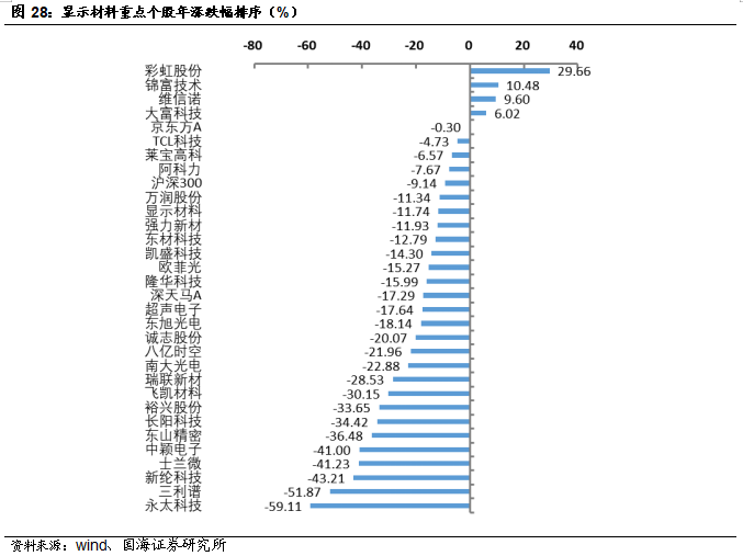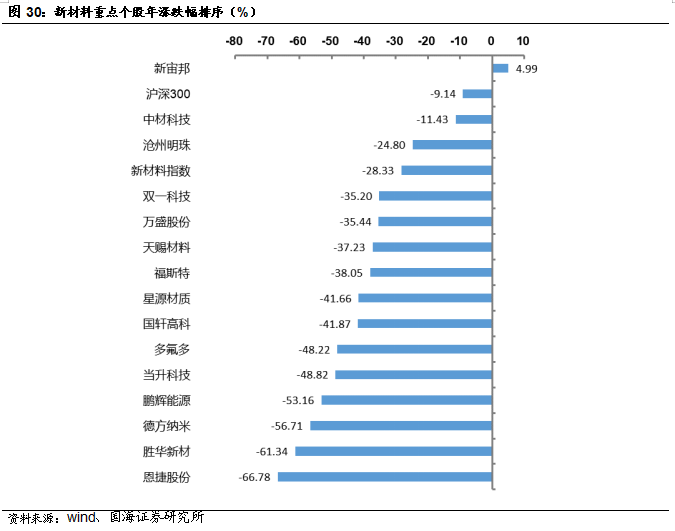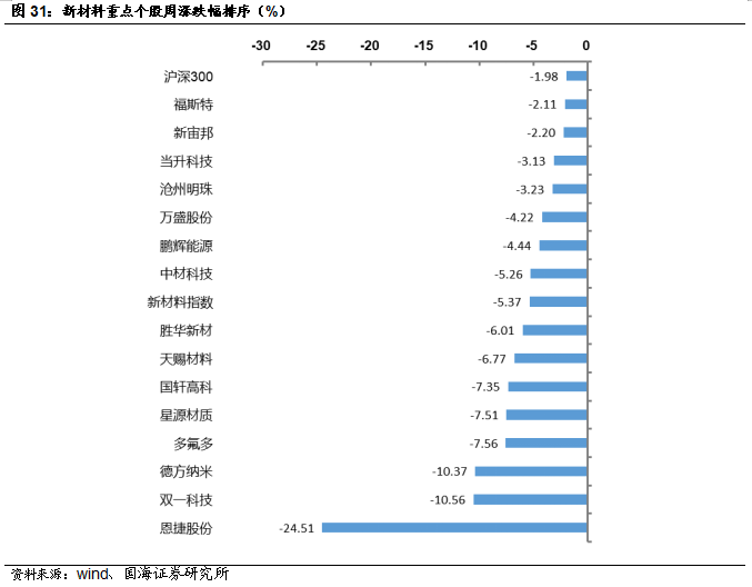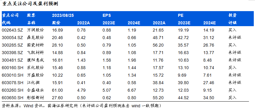 建议关注鼎龙股份,公司是国内唯一一家全面掌握CMP抛光垫全流程核心研发技术和生产工艺的CMP抛光垫供应商,在国内抛光垫市场中处于领先地位。重点推荐国瓷材料,公司是我国无机新材料平台型公司,熟练掌握了水热法核心技术,内生的MLCC陶瓷粉、氧化锆、氧化铝均达到世界级水平;外延并购的王子制陶(陶瓷制品)和爱尔创(氧化锆下游制品)均是公司产品的下游,都迎来快速增长。建议关注飞凯材料,公司主营业务为高科技制造领域适用的屏幕显示材料、半导体材料及紫外固化材料等的研究、生产和销售以及医药行业中间体产品的生产和销售。公司重要全资子公司和成显示掌握液晶显示材料关键技术,完成了国内第一款具有核心自主知识产权的TFT新结构单体及混合液晶的开发。和成显示是中高端TN/STN领域主要供应商,并且是国内少数能够提供TFT类液晶材料的供应商之一。建议关注濮阳惠成,公司专注顺酐酸酐衍生物和功能中间体产品的研发和生产,受益于我国电子信息产业的快速发展、我国智能电网、超/特高压输电线路投资力度的不断加大、新型复合材料的广泛应用,对顺酐酸酐衍生物的需求持续增长。重点推荐巨化股份,公司是国内领先的氟氯化工新材料供应商和氟化工完整产业链企业,是全球氟制冷剂、氟制冷剂配套氯化物原料(甲烷氯化物、三氯乙烯、四氯乙烯)、PVDC 系列产品龙头企业。公司主要产品采用国际先进标准生产。建议关注万盛股份,公司有机磷系阻燃剂以聚氨酯和工程塑料改性客户为主,主要为拜耳、科思创、巴斯夫、SABIC、陶氏化学、金发等国内外知名的化学工业品、改性塑料生产企业。子公司万盛大伟多年来聚焦于特种脂肪胺类、功能日化添加剂等精细化工产品的研发、生产和销售,经过多年的发展,在细分市场中已居于领先位置。建议关注江化微,公司是国内产品品种最齐全、配套能力最强的湿电子化学品生产企业之一,产品能够广泛的应用到平板显示、半导体及LED、光伏太阳能等多个电子领域,同时能在清洗、光刻、蚀刻等多个关键技术工艺环节中应用。重点推荐合盛硅业,公司主要从事工业硅及有机硅等硅基新材料产品的研发、生产及销售,是我国硅基新材料行业中业务链最完整、生产规模最大的企业之一。重点推荐彤程新材,公司积极推进电子材料业务,紧紧抓住关键材料急需国产化替代的契机,巩固半导体光刻胶和显示光刻胶板块协同发展的优势,实现光刻胶横向产业新突破,并反溯核心原材料的开发,加快公司电子酚醛树脂在光刻胶领域的开发及导入,充分发挥公司产业链优势,形成产业链一体发展的新模式。风险提示:替代技术出现;行业竞争加剧;经济大幅下行;产品价格大幅波动;重点关注公司业绩不达预期等。