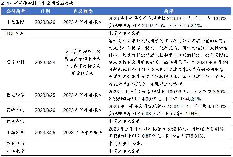 8月23日,大半导体产业网:英特尔副总裁兼亚太区总经理Steven Long表示,目前英特尔正在马来西亚槟城兴建最新的封装厂,强化2.5D/3D封装布局。这将是继英特尔新墨西哥州及奥勒冈厂之后,首座在美国之外采用英特尔Foveros先进封装架构的3D封装厂。英特尔表示,规划到2025年时,其3D Foveros封装的产能将达到当前水平的四倍。8月22日,大半导体产业网:台积电美国亚利桑那州厂已导入当地第一台极紫外光(EUV)设备,建厂进入安装先进及精密设备的关键阶段,虽然现场已有约1.2万名建厂人员,但目前仍有约2000名相关设备安装工程人员岗位空缺。根据计划,台积电将在美国亚利桑那州投资400亿美元建设2座先进晶圆厂,第1座工厂目前已完成建设,正进行设备安装作业,预计2025年量产4纳米制程;第2座晶圆厂建设正在顺利进行中,基于3纳米制程技术,预计将在2027年完工量产。8月22日,中国运动健康公众号:据“中国运动健康”公众号消息,日前,中国航天员系统副总设计师李莹辉在载人航天工程空间应用与发展情况介绍会上表示:在中国空间站任务期间,科研团队完成了国内首例太空器官芯片研究。在此次航天任务中,东南大学苏州医疗器械研究院、中国航天员科研训练中心、数字医学工程全国重点实验室、江苏艾玮得生物科技有限公司共同开发制作的太空血管组织芯片(Taikonaut-Blood-Vessels-on-a-Chip, Taikonaut)完成了国际上首次血管组织芯片在长期微重力条件下的培养实验。该器官芯片是我国独立自主研制,是我国第一次在轨实施器官芯片项目,也是国际首次在轨开展人工血管器官芯片研究,标志我国成为世界上第二个具备在轨开展器官芯片研究能力的国家。中芯国际:8月26日,公司发布公告称,2023年上半年公司实现营收213.18亿元,同比下降13.3%;实现归母净利润29.97亿元,同比下降52.1%。巨化股份:8月25日,公司发布公告称,2023年上半年公司实现营收100.96亿元,同比下降3.89%;实现归母净利润4.90亿元,同比下降48.61%。8月21日,LED inside:苹果在欧洲申请的专利表明,苹果致力于研究硅基铁电液晶(fLCoS)显示技术。自2020年以来,苹果显示屏团队一直致力于此,该专利于8月16日在欧洲公布。苹果在其专利中指出,诸如头戴式设备之类的电子设备可能具有一个或多个近眼显示器,可以为用户生成图像。头戴式设备可以是一副VR头显或AR眼镜,允许用户查看计算机生成的图像和周围环境中的现实世界对象。显示器可以包括显示模块和波导。显示模块可以包括空间光调制器,例如硅上铁电液晶(fLCOS)显示面板和照明光学器件。8月22日,集邦咨询:根据TrendForce集邦咨询调查显示,今年电视面板价格于2月开始起涨后,随即进入中国618促销备货期,加上北美预估今年电视销售维持3~4%成长动能,品牌为了降低整机生产成本而现提前出货,带动第二季电视出货季增7.6%,年增2.1%,合计上半年全球电视出货量达9,004万台,年减3.5%。8月24日,LED inside:索尼日前推出了一款型号为ECX344A的微型OLED显示屏,该显示屏主要用于AR及VR方向,拥有4K分辨率,刷新率达90 Hz,覆盖96% DCI-P3 色域。官方表示,这款ECX344A显示屏采用了索尼在开发旗下相机EVF(电子取景器)时实现的“微型化工艺”,从而在1.3英寸的空间内塞下4K分辨率与90Hz的高刷新率,实现“流畅而明快的图像质量”。此外,索尼还宣称,这款屏幕独有的像素结构还可实现“极佳的宽色域和高亮度性能”,有助于“支持VRAR头戴式显示器的新体验”。飞凯材料:8月25日,报告期内公司实现营业收入13.18亿元,同比-19.88%。实现归属于上市公司股东的净利润1.74亿元,同比-31.08%。经营活动产生的现金流量净额541万元,同比-97.26%。