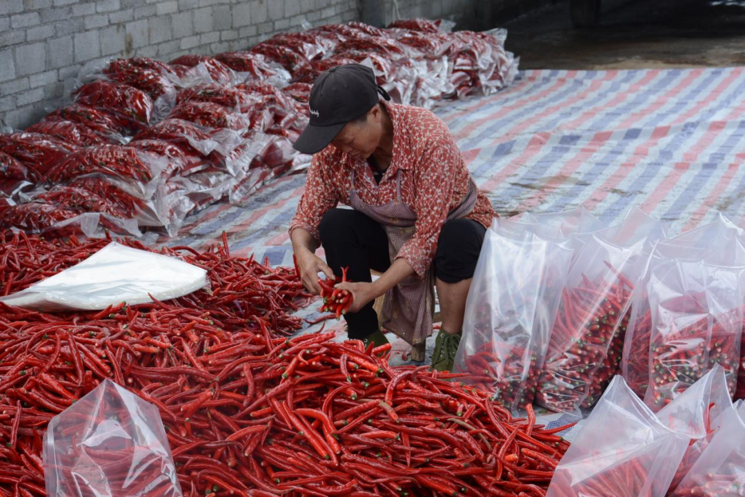 在位于联合社区的辣椒收购初加工点,十余名工人明确分工,有的骑着三轮车拉着刚从基地采摘回来的辣椒,有的正挑选优质辣椒装袋,有的忙着加水放盐封袋保鲜……现场有条不紊地进行着,一派忙碌丰收的喜人景象。