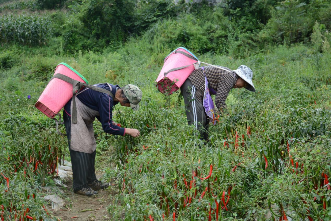 时下,正值辣椒丰收时节,在织金县三塘镇大方寨村的辣椒种植示范点,椒农们正背着背篓俯身采摘红辣椒,娴熟地穿梭在辣椒地中采摘、装袋。“辣椒要摘全红的,不红的不要摘,一定要挑好的摘哈。”基地负责人忙着给椒农们叮嘱。