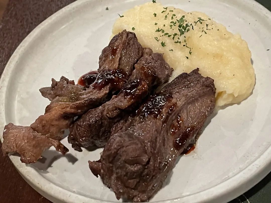 它叫20小时低温慢烤牛肋条,全熟但非常软嫩。土豆泥味道是天然的香。