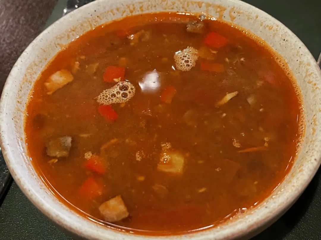 餐前汤品,祖母传统连奴豆汤。样子有些像罗宋汤,其实几乎没有酸味,淡淡的咸味,里面有一些蔬菜和煮得很软的豆子。