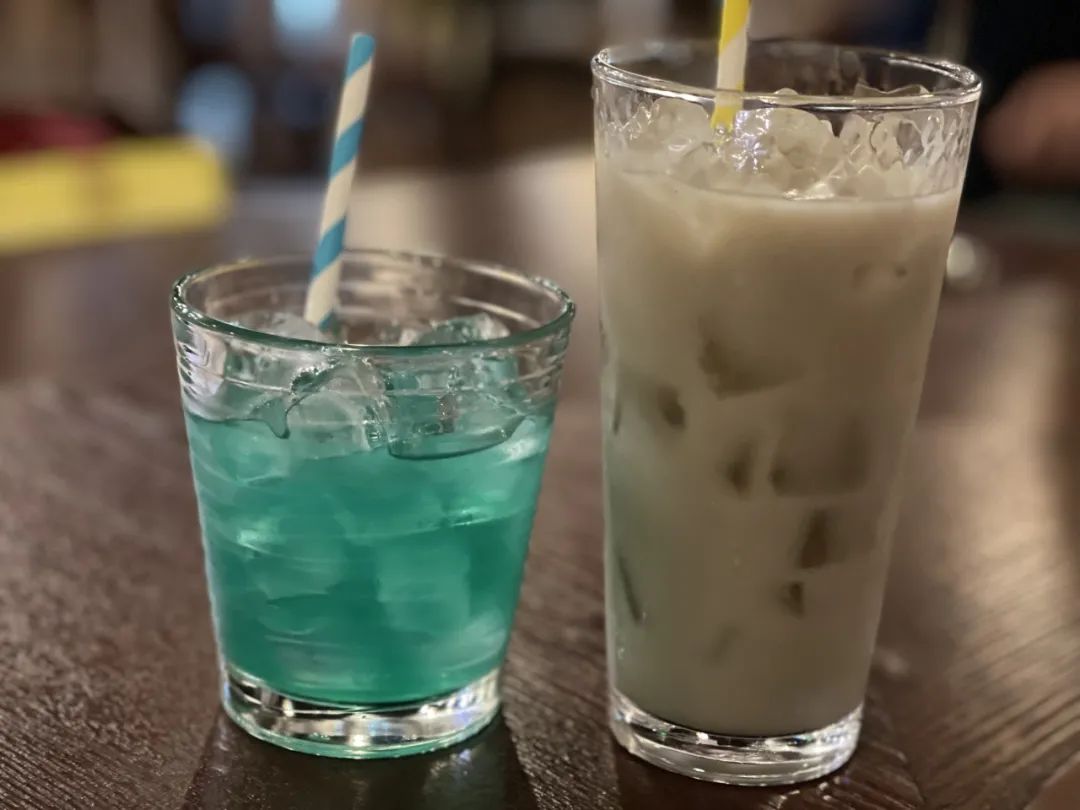 饮品部分,左边的是蜂蜜白兰地,几乎没有酒精味,酸甜柑橘味道。右面则是用马黛茶调和成的奶茶,很香。