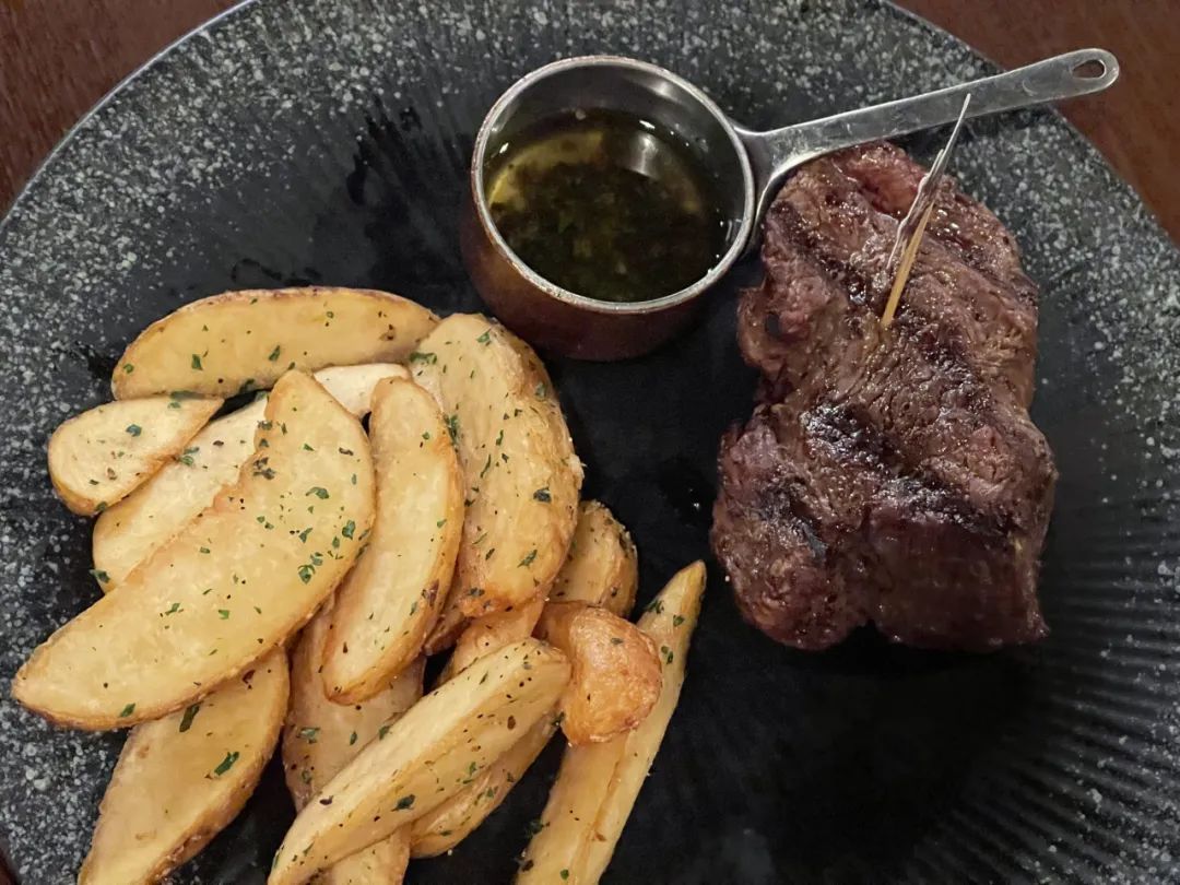 真是一块非常好的肉,七分熟,中间带血的部分一点也不腥,是一种独特的鲜味。早知道肉质这么好,应该要五分熟了。酱汁不是黑椒酱,是橄榄油混合欧芹碎和盐的。今日最佳菜品!