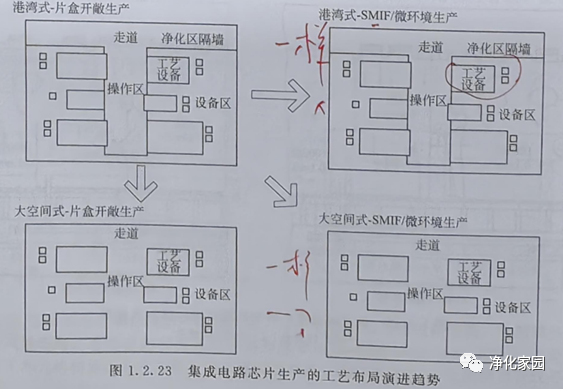 图1.2.23是集成电路芯片生产用洁净厂房的工艺布局演变趋势。对于4~6in芯片的生产,由于通常采用片盒开敞式传送方式,操作区空气中的尘埃会直接影响硅片电路的电气性能,因此对于操作区的洁净度要求较严格,通常采用以壁板将操作区与设备区分开的港湾式布局。随着芯片尺寸向8in及12in 发展,大面积高洁净度净化区的造价、运行费越来越高,因此采用标准机械接口加微环境的方式成为8in及12in芯片生产方式的主流。此种方式硅片放在密闭的片盒中,在运输、加工过程不会被环境污染,操作区可采用较低的洁净度等级。在生产区中就没有采用隔墙将操作区和设备区隔开,还可提高设备布置的灵活性,所以8~12in芯片生产的核心区宜采用大空间式布置的微环境和标准机械接口系统,并将生产辅助设备布置在下技术夹层。