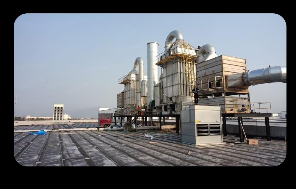 该机适用于印染定型机 , 涂层定型机 , 植绒定型机的尾气五级净化,其独特螺旋水膜 、恒流源电场 。多重除雾 、 光氧除味 、升温除雾 、双重防火措施。