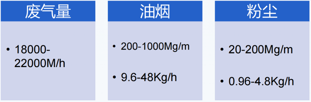 生产过程中,废气温度大约为 190~240°c,单台废气量大都在 18000~20000m³h位以上,合计 36000~40000mh,废气中油烟的 浓度一般在200~1000mg/m范围 内。