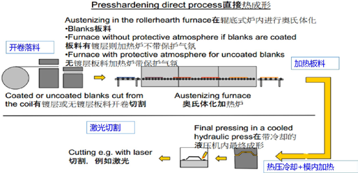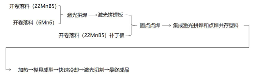 落料——拼焊——固定点焊——转移——加热和保温——转移——冲压成形和保压淬火——转移——后续处理