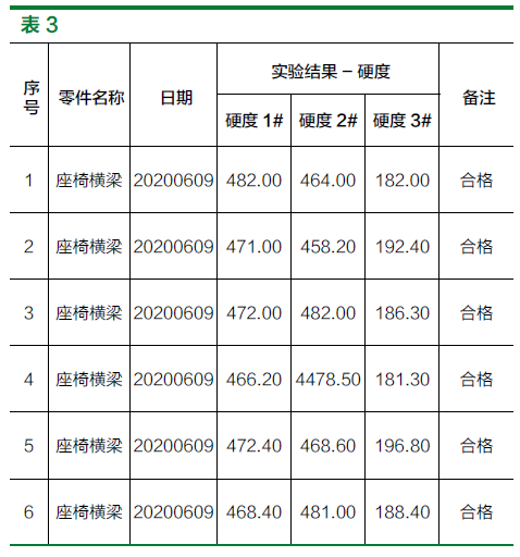 分别对左右件零件取样3辆份,进行了硬度实验,实验结果均满足技术要求。