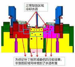 ①除在型面以下8mm~10mm范围内设计冷却水道对模具进行冷却;
