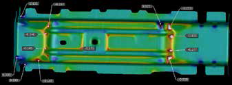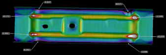 以图3、图4所示为汽车前座椅后横梁零件,分为三个区域:高强度区域(22MnB5)、低强度区域(6Mn6)、补丁板区域(22MnB5),三个区域在模具中均依靠快速冷却来得到我们最终需要的产品性能。