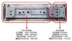 高强度区域(22MnB5)硬度要求:维氏硬度≥400HV,低强度区域(6Mn6)硬度要求:维氏硬度175~215HV。