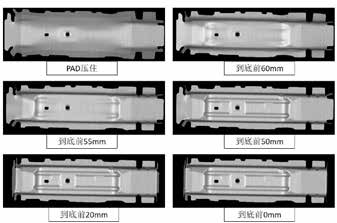 图7为按照图6的成型工具体设置模拟该产品的成形工艺过程,分别从PAD压住、到底前60mm、到底前55mm、到底前50mm、到底前20mm、完全到底等几个过程观察零件的成形过程中是否有开裂和起皱的风险。