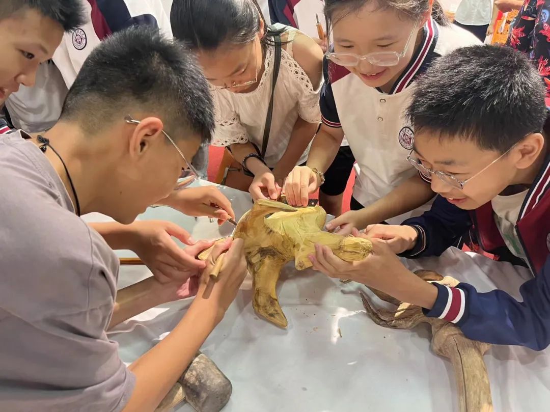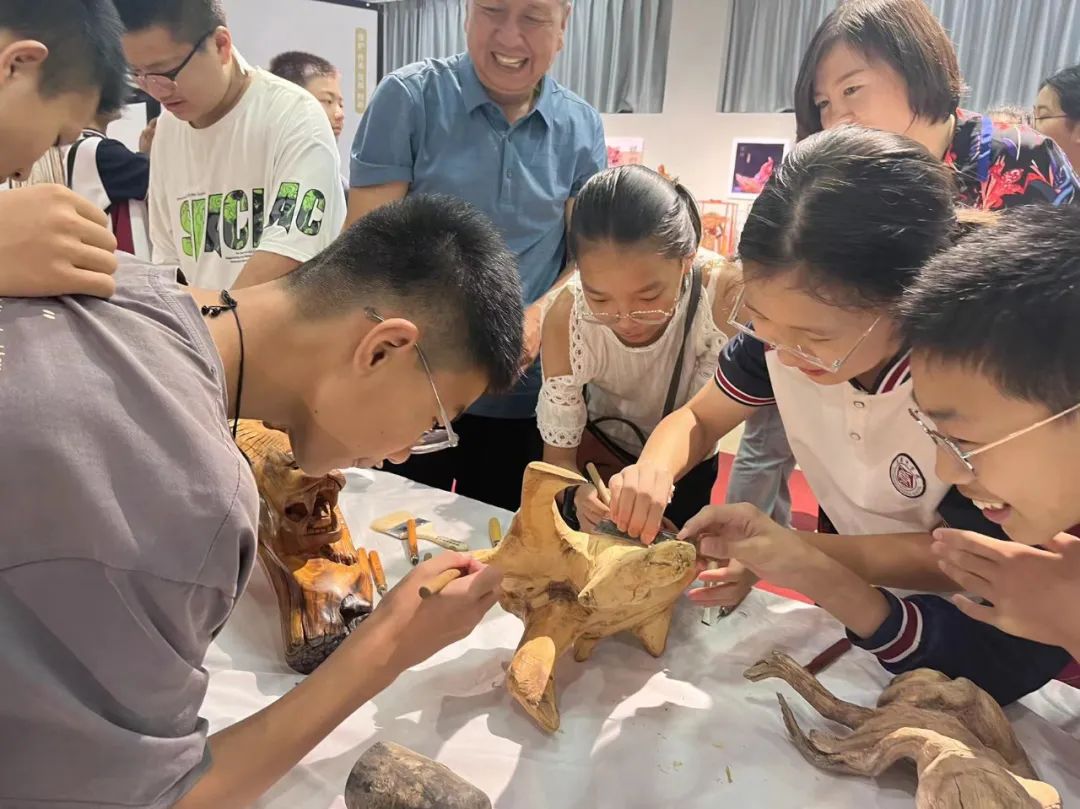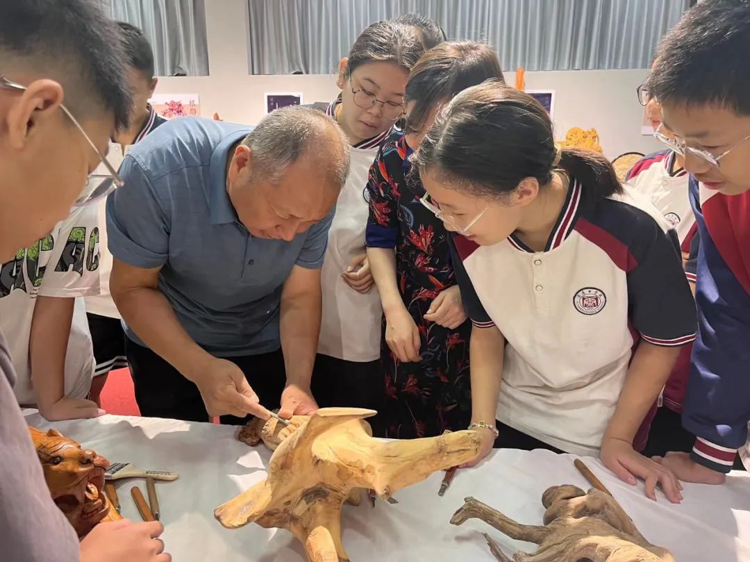 邀请市级工艺美术大师冯长年带领学生们进行木雕、根雕的初次探究,为大家讲解木雕知识、现场演示雕刻手法,同学们亲身体验、互动教学,激发学生对木雕的喜爱,对工艺美术的兴趣。