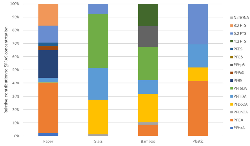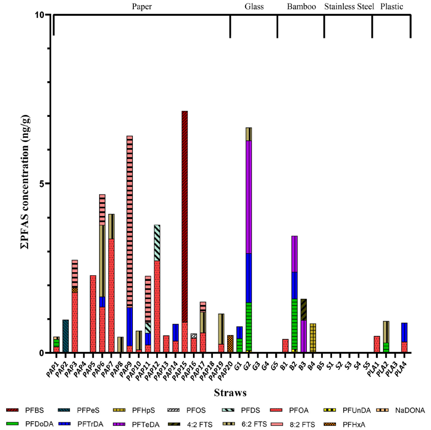 具体来说,最显著的是纸吸管,其中90%的PFAS检测呈阳性。80%竹吸管PFAS检测呈阳性,75%的塑料吸管PFAS检测呈阳性,40%的玻璃吸管PFAS检测呈阳性,值得注意的是,不锈钢吸管完全不含PFAS。