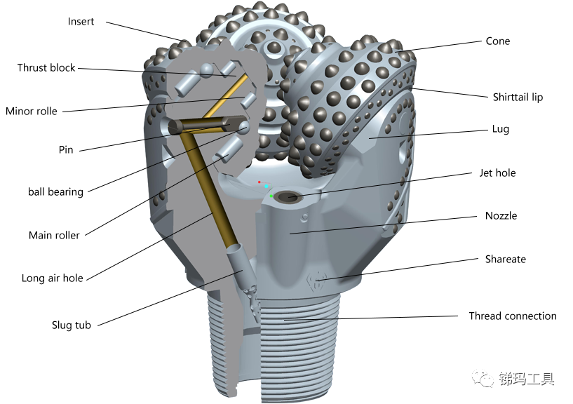 随着交通、开采工业的遍地开花,凿岩工业也得到快速发展,凿岩工具的用量逐年上升。钎具是凿岩的牙齿,在凿岩过程中要承受剧烈的振动、冲击和腐蚀等不良工况,极易损耗。牙轮钻是凿岩钎具的重要一员,牙轮钻分为铣齿牙轮钻和镶齿牙轮钻。镶齿牙轮钻因为钻齿为硬质合金,具有高硬度、高耐磨性和高耐腐蚀能力,可钻凿的孔径大,凿岩速度快、寿命高,凿出的孔型较圆,所以在凿岩工作中应用广泛。牙轮钻包括单齿、双齿和三齿三类,一般以三齿结构居多,具体的种类有:水井用牙轮钻、矿用牙轮钻、旋挖钻、非开挖钻。