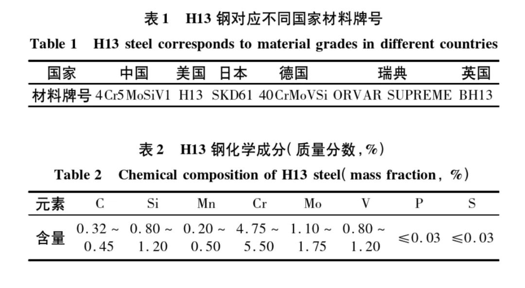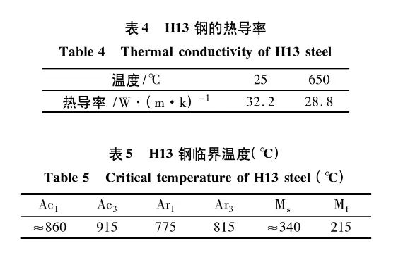 H13钢的国际标准化组织材料牌号为40CrMoV5,对应不同国家的材料牌号见表1,其材料成分和物理性能见表2~表4 [1] 。H13钢的热处理临界温度见表5。