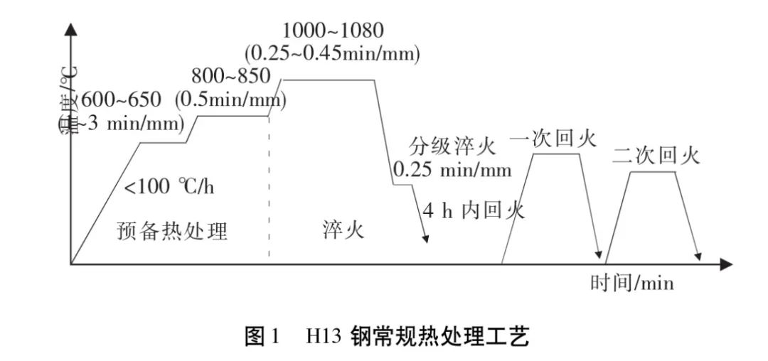 H13钢常规热处理工艺主要包括预备热处理、淬火和回火,如图1所示。