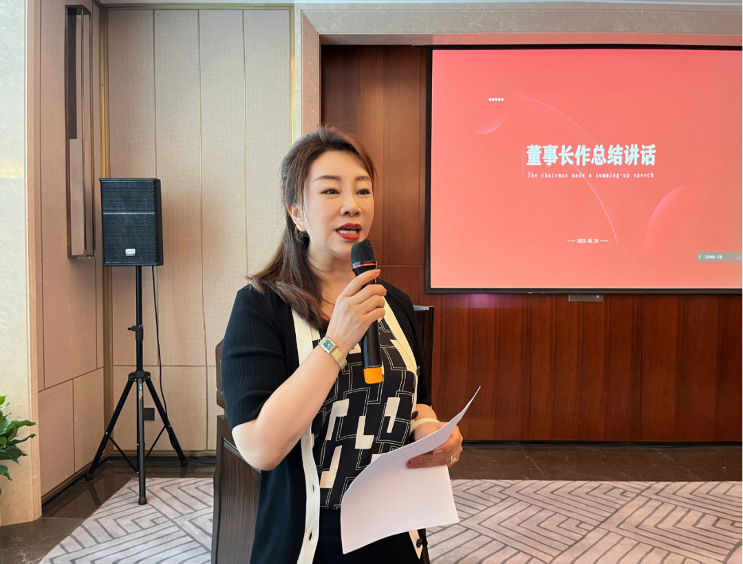 韩玲董事长做总结发言,她首先向大运会赛事运营团队和完成年度目标的业务人员所取得的工作成绩表示肯定,给予高度评价。