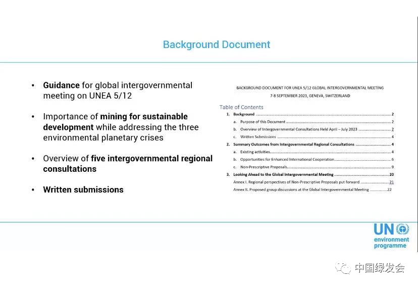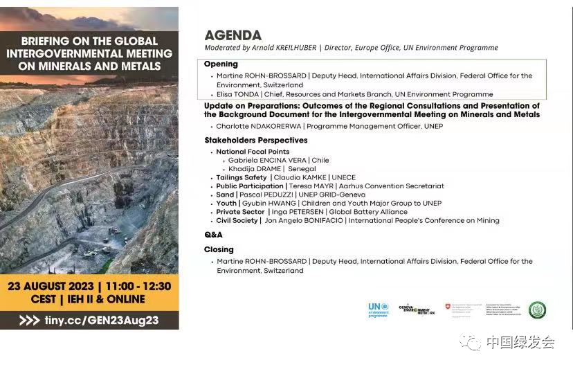 2023年8月23日星期三11:00至12:45分(日内瓦时间),中国生物多样性保护与绿色发展基金会(简称中国绿发会、绿会)受邀参加由联合国环境规划署(UNEP)主办的关于全球矿产和金属政府间会议的简介会。绿会代表肖莹佳出席本次会议。