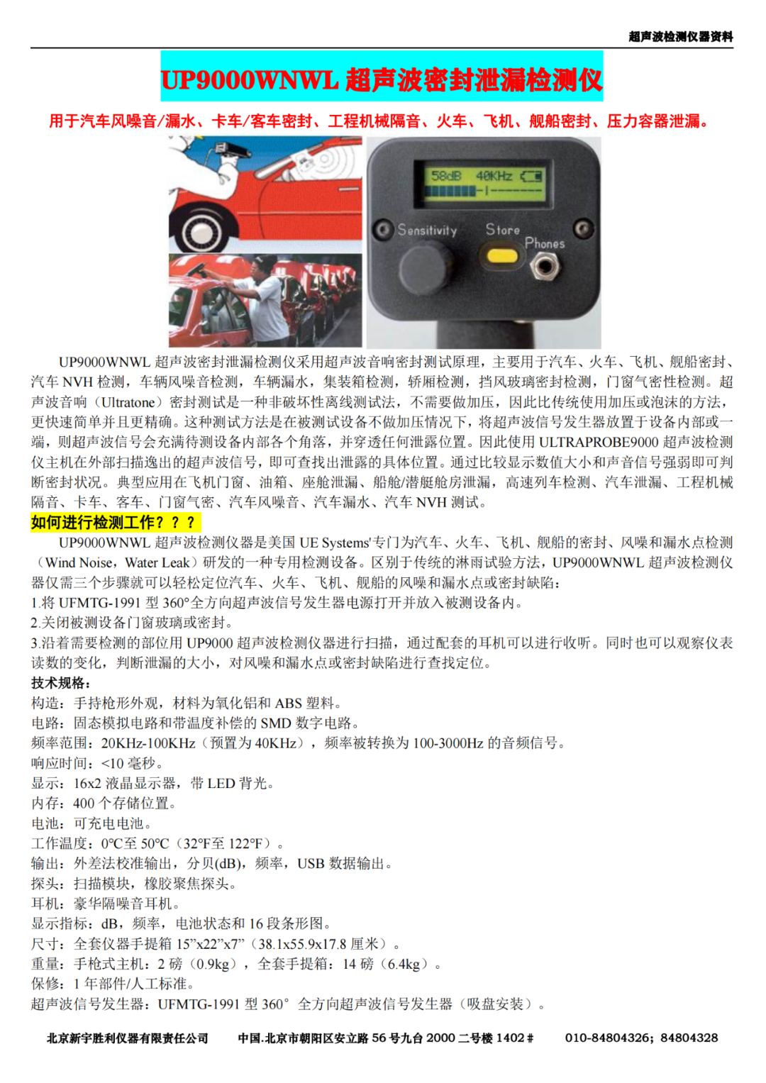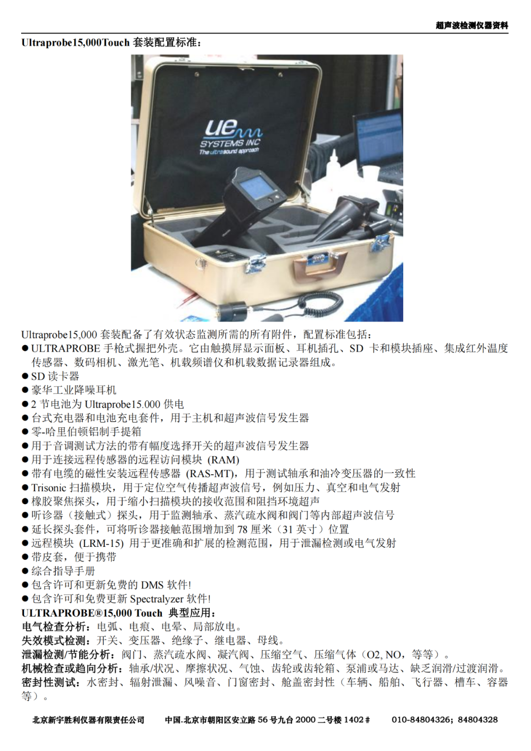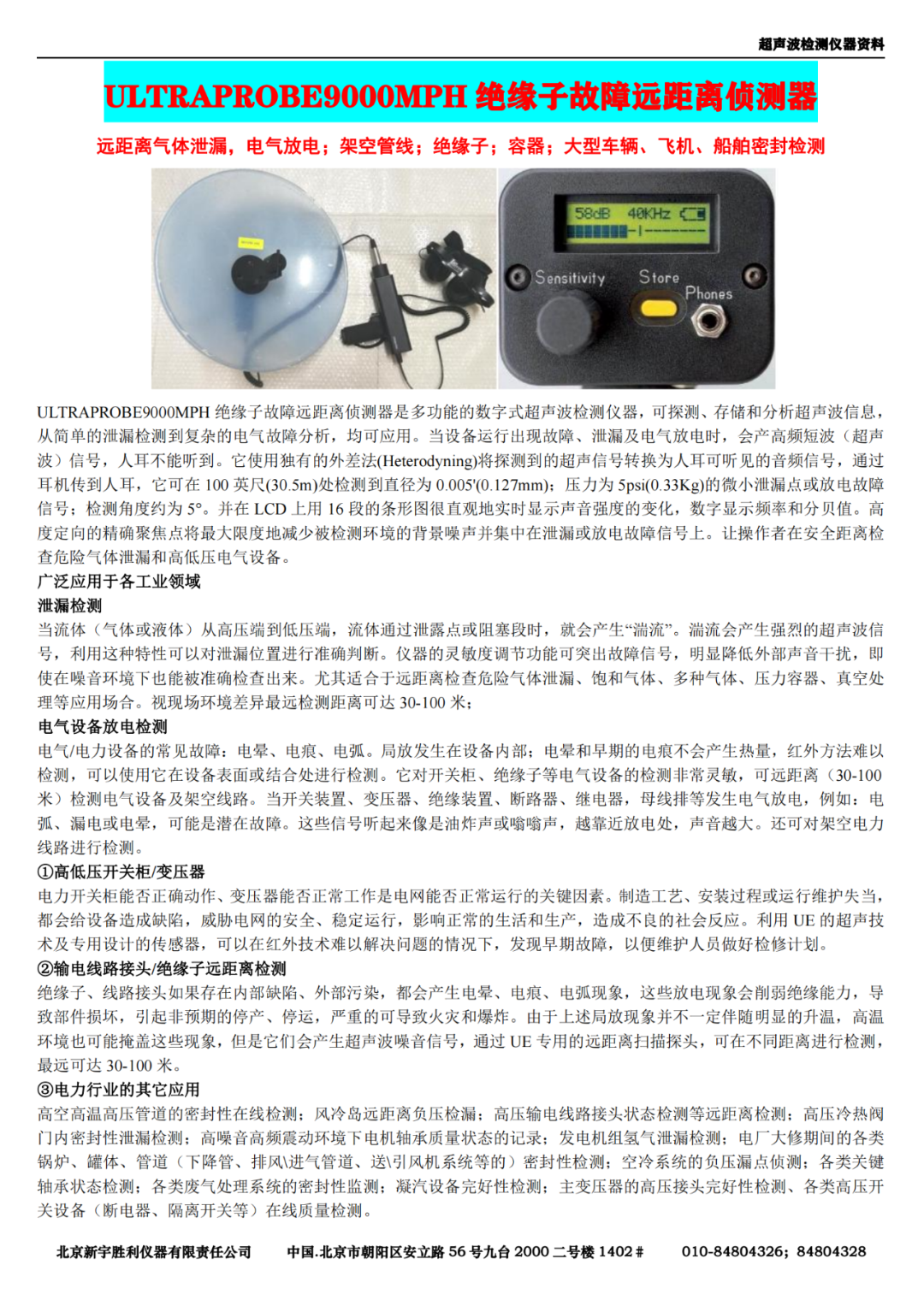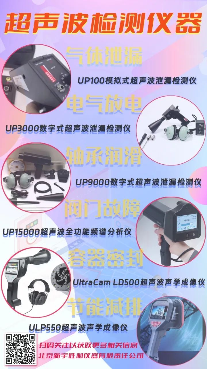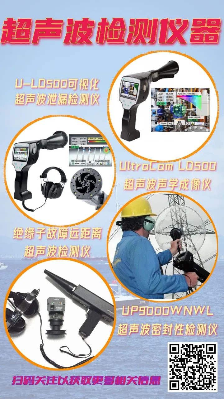 超声波检测仪器的典型应用包括:压缩气体检漏;气体压力或真空泄漏检测(不限气体类型);轴承磨损和润滑缺陷;机械运行的趋势,包括轴承,润滑失效,并有助于防止轴承的过度润滑。阀门内漏;蒸汽疏水阀故障;船舶舱室泄漏,轿车和卡车密封检测。车辆风噪声和水泄漏,挡风玻璃密封检测;飞机座舱压力泄漏。电气系统故障放电检查;电气火花放电;消防电气防火;电力电晕放电,电弧,绝缘子故障远距离检测;
