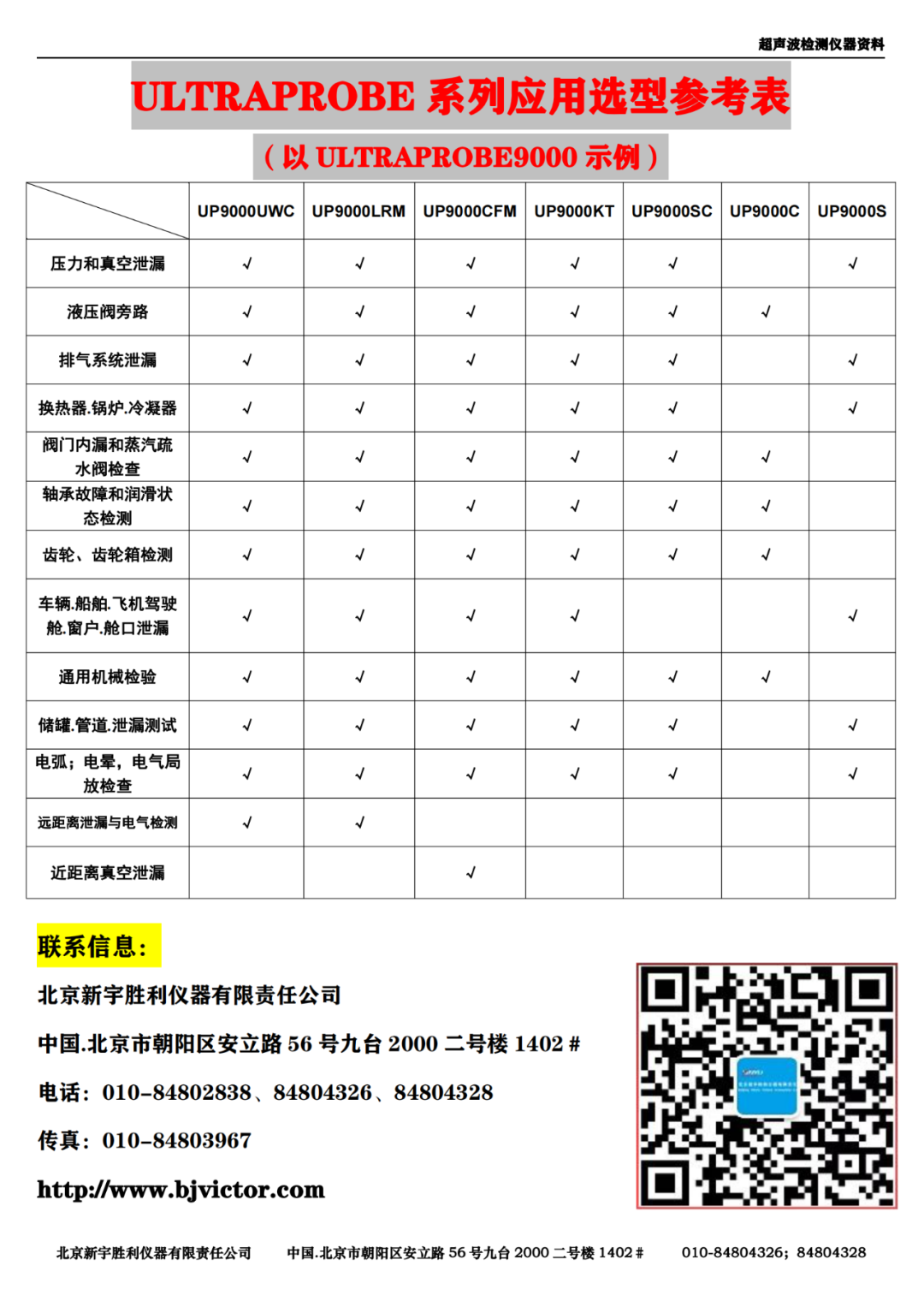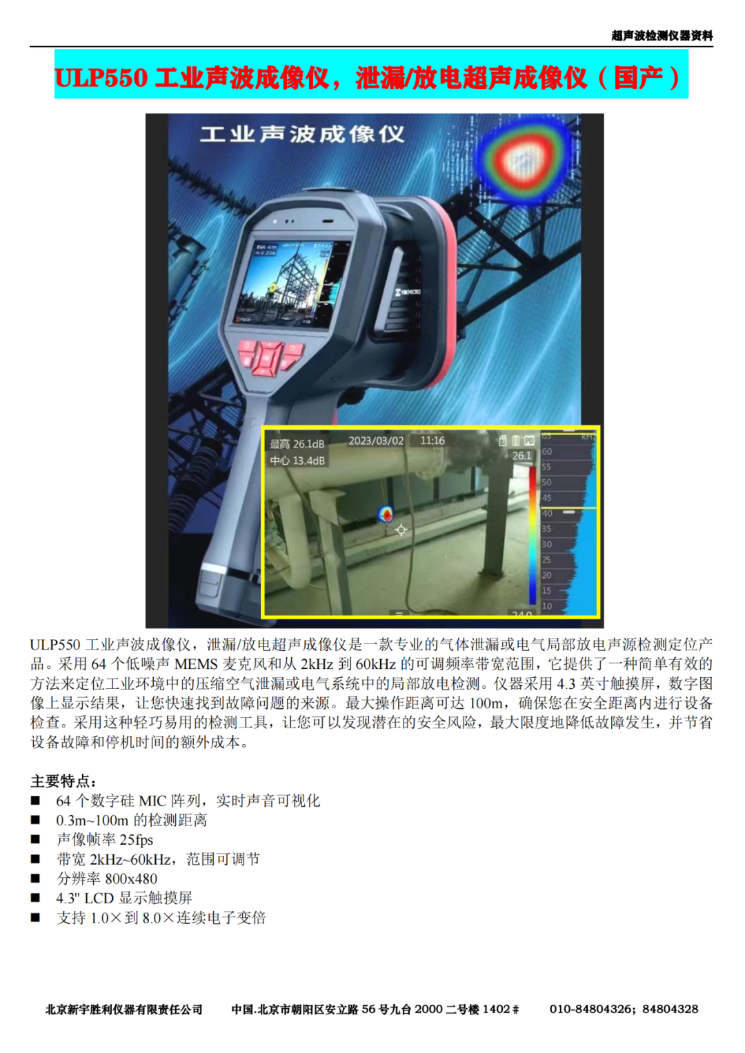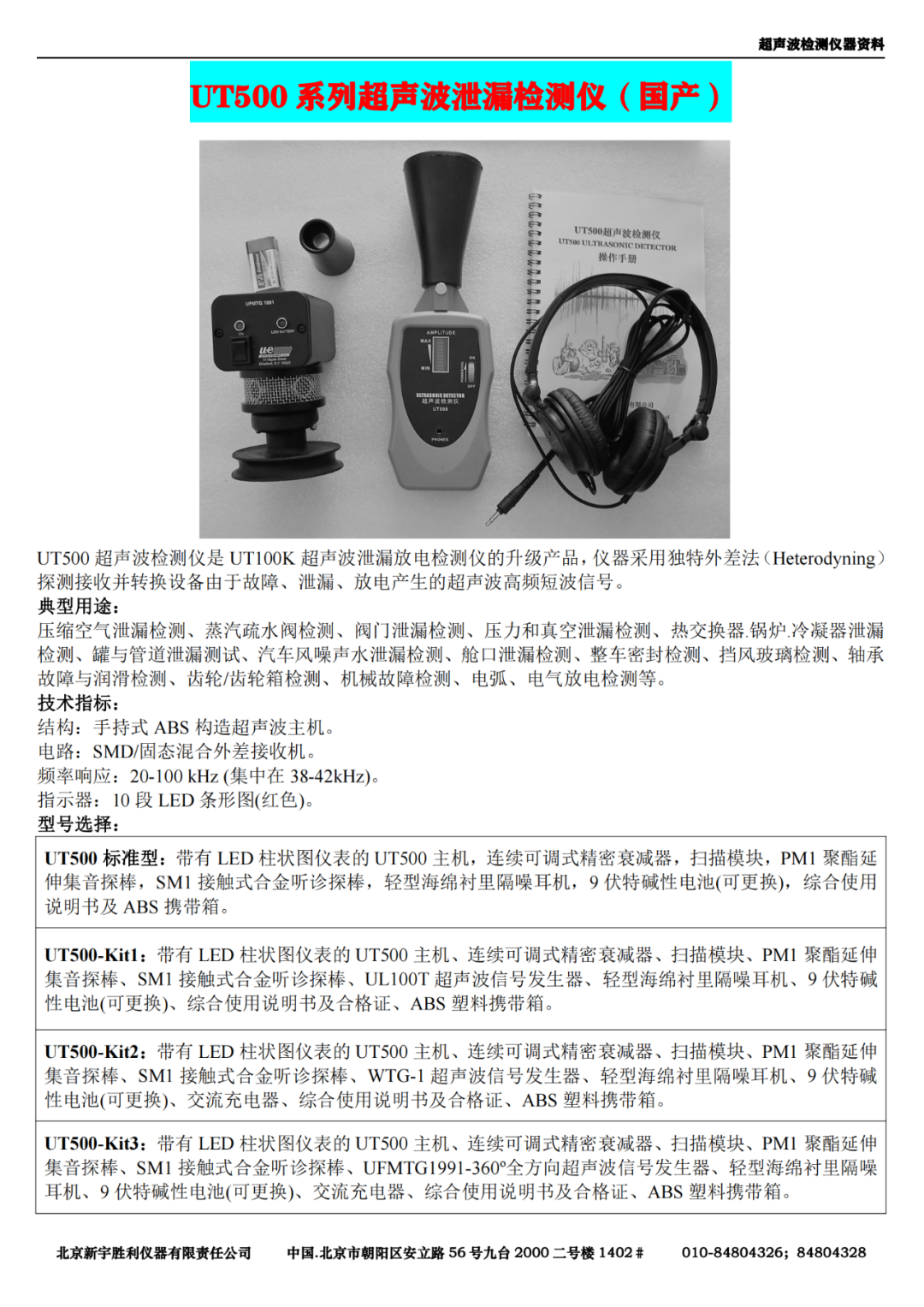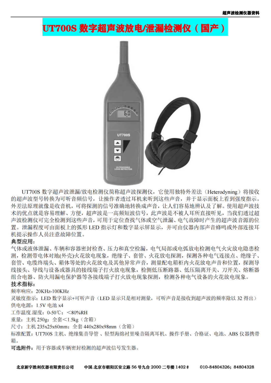超声波检测仪器的典型应用包括:压缩气体检漏;气体压力或真空泄漏检测(不限气体类型);轴承磨损和润滑缺陷;机械运行的趋势,包括轴承,润滑失效,并有助于防止轴承的过度润滑。阀门内漏;蒸汽疏水阀故障;船舶舱室泄漏,轿车和卡车密封检测。车辆风噪声和水泄漏,挡风玻璃密封检测;飞机座舱压力泄漏。电气系统故障放电检查;电气火花放电;消防电气防火;电力电晕放电,电弧,绝缘子故障远距离检测;