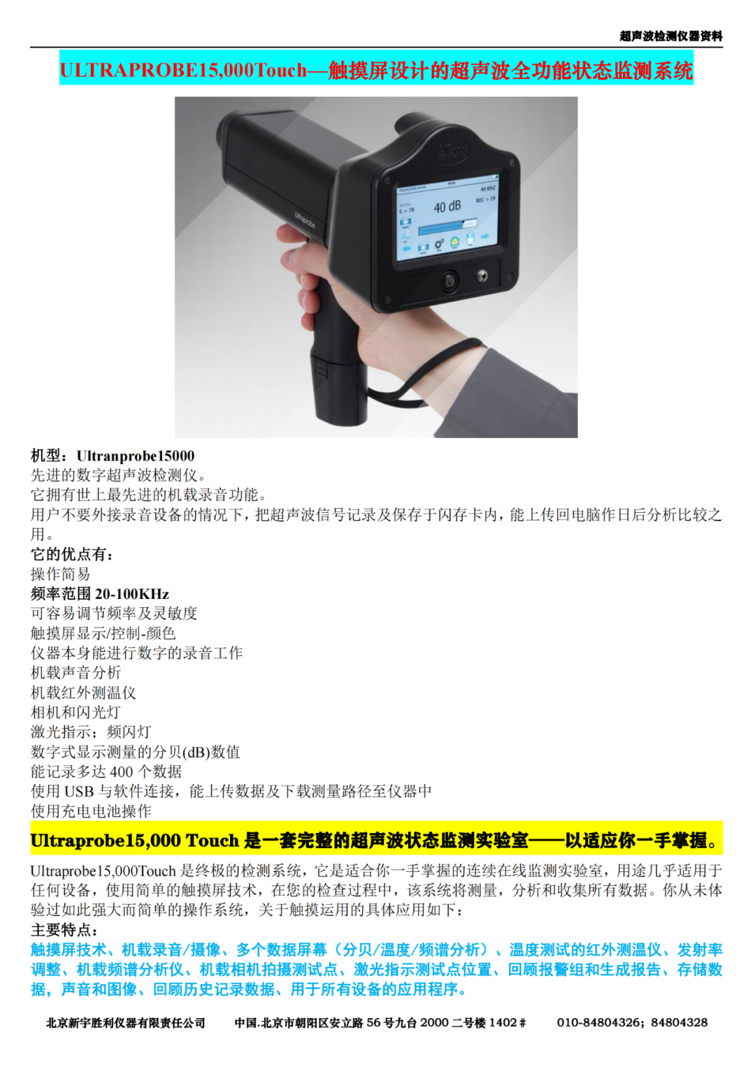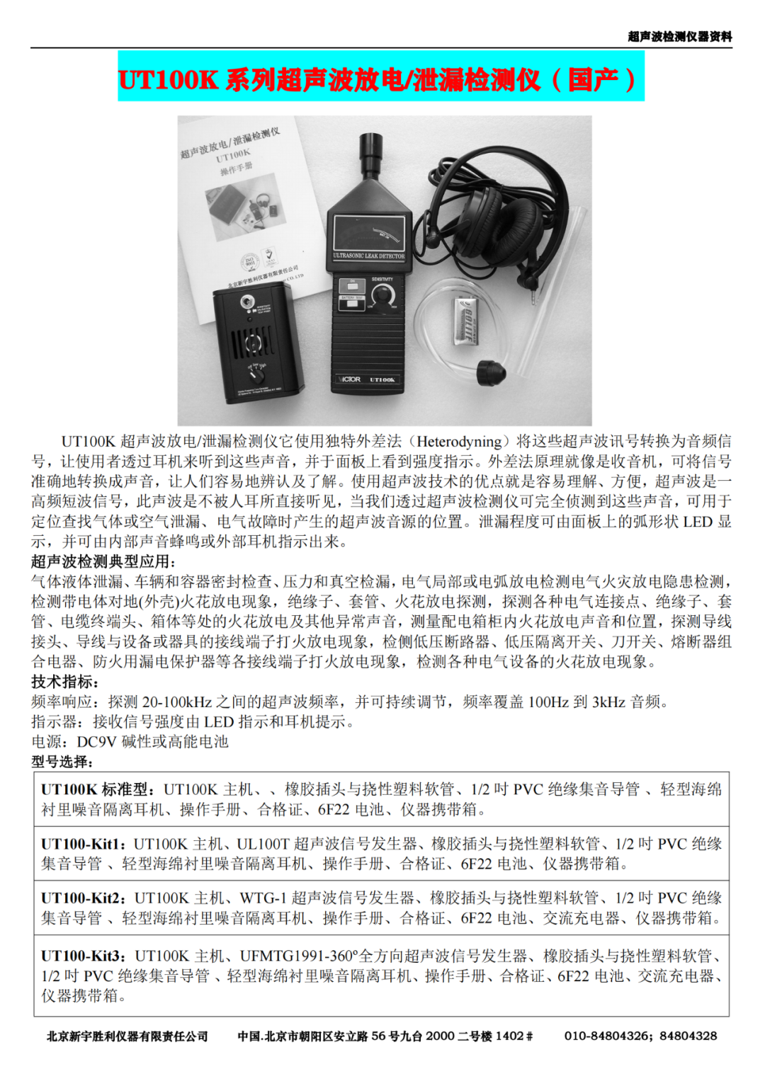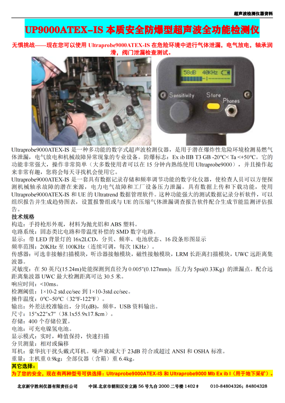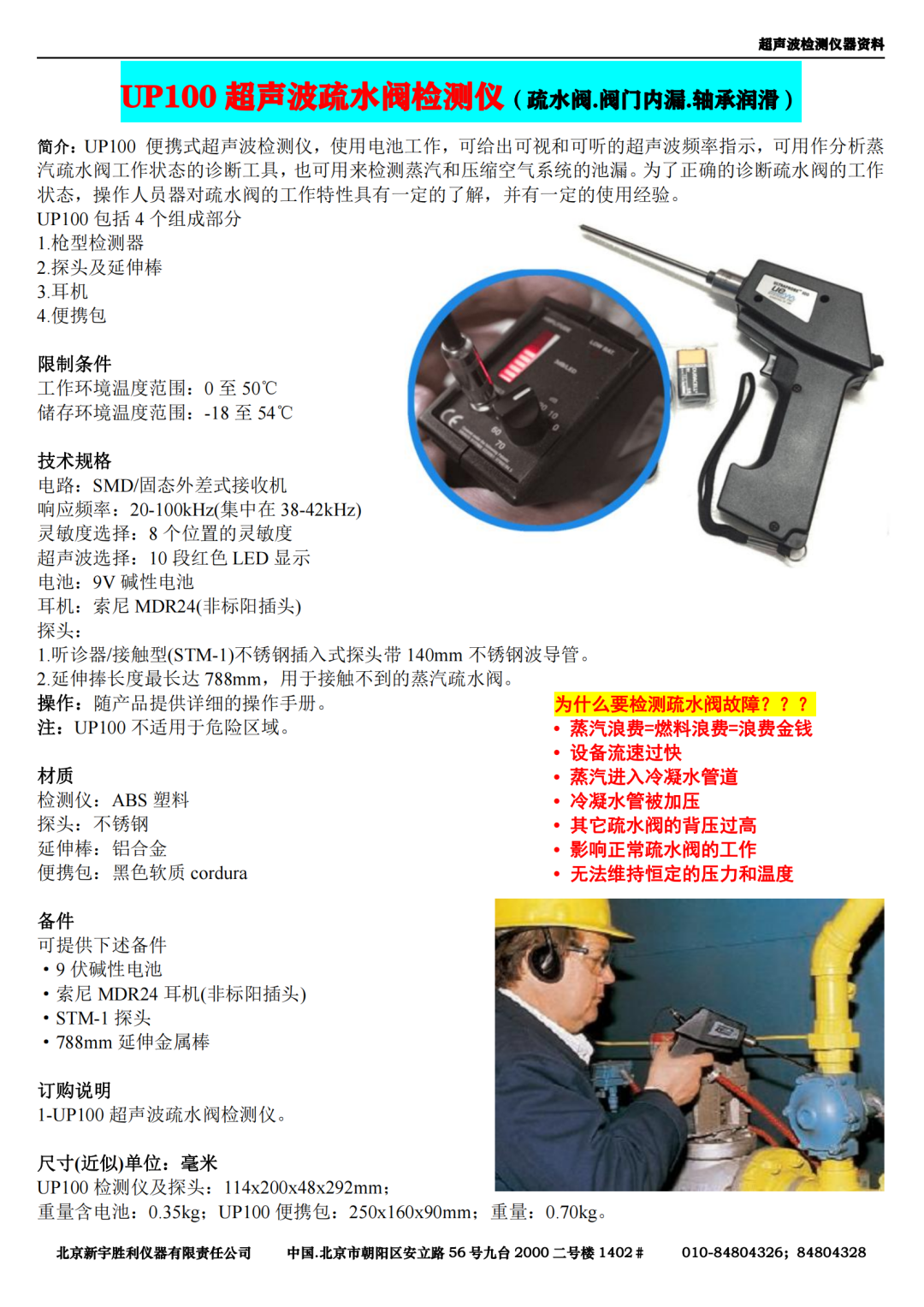 超声波检测仪器的典型应用包括:压缩气体检漏;气体压力或真空泄漏检测(不限气体类型);轴承磨损和润滑缺陷;机械运行的趋势,包括轴承,润滑失效,并有助于防止轴承的过度润滑。阀门内漏;蒸汽疏水阀故障;船舶舱室泄漏,轿车和卡车密封检测。车辆风噪声和水泄漏,挡风玻璃密封检测;飞机座舱压力泄漏。电气系统故障放电检查;电气火花放电;消防电气防火;电力电晕放电,电弧,绝缘子故障远距离检测;