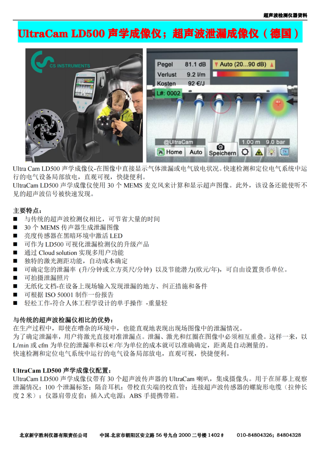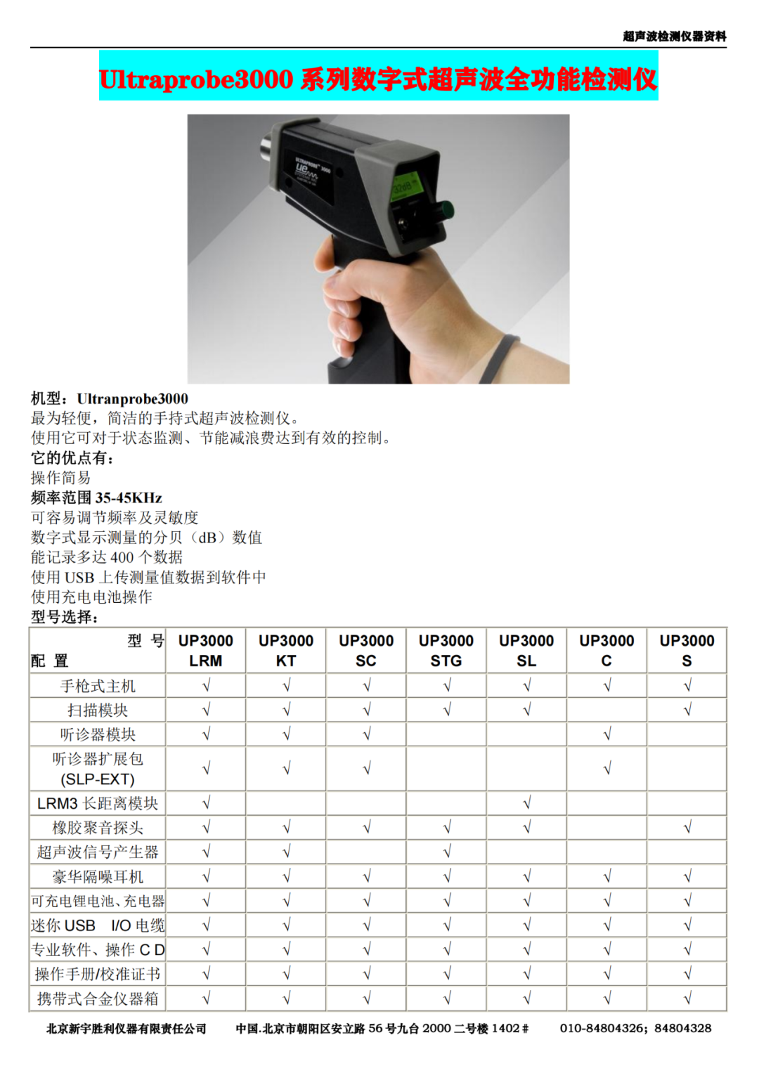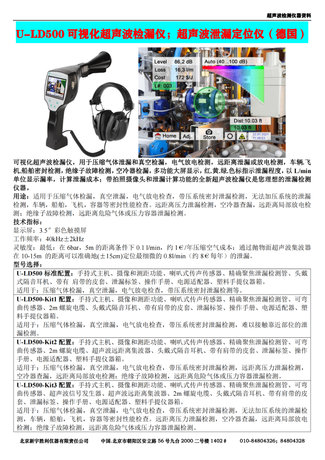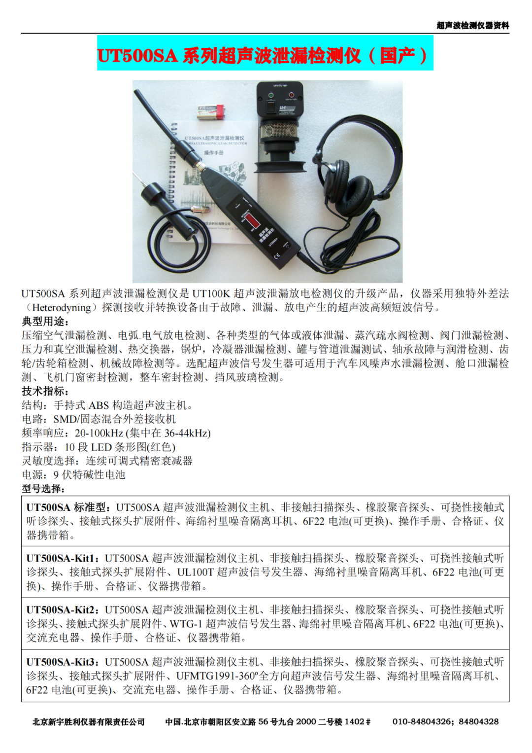 超声波检测仪器的典型应用包括:压缩气体检漏;气体压力或真空泄漏检测(不限气体类型);轴承磨损和润滑缺陷;机械运行的趋势,包括轴承,润滑失效,并有助于防止轴承的过度润滑。阀门内漏;蒸汽疏水阀故障;船舶舱室泄漏,轿车和卡车密封检测。车辆风噪声和水泄漏,挡风玻璃密封检测;飞机座舱压力泄漏。电气系统故障放电检查;电气火花放电;消防电气防火;电力电晕放电,电弧,绝缘子故障远距离检测;