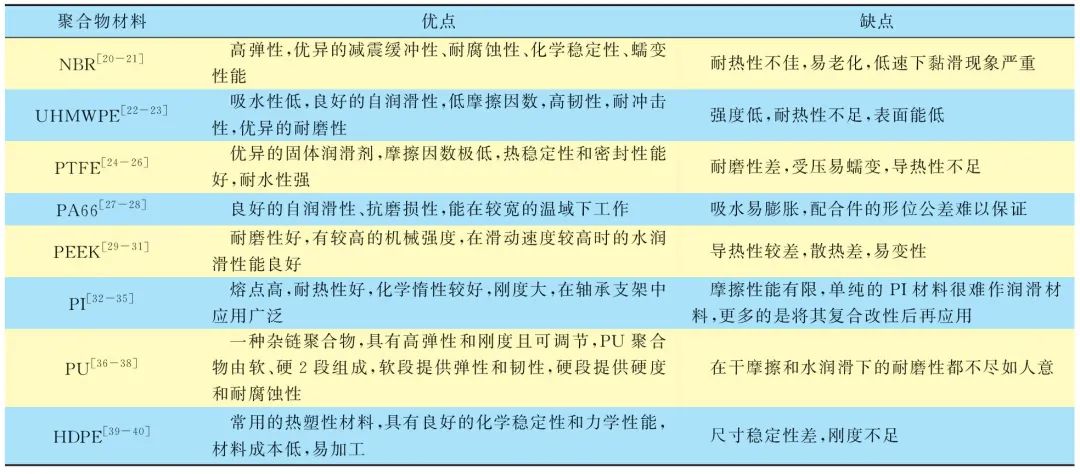 目前常用于水润滑轴承的聚合物材料主要有橡胶和塑料,其中丁腈橡胶(NBR)、超高分子量聚乙烯(UHMWPE)、聚四氟乙烯(PTFE)、尼龙(PA66)、聚醚醚酮(PEEK)、聚酰亚胺(PI)、聚氨酯(PU)、高密度聚乙烯(HDPE)等聚合物材料常被用作轴瓦材料,其性能对比见表1。