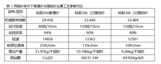 强捻纱与普通纱工艺设计的区别主要在细纱工序。由于捻度大、捻缩大,考虑到加捻效率和保证开车生活稳定,在捻度、锭速、前罗拉速度、机械牵伸倍数的设计以及钢丝圈的选择上均有较大的变化(见表 1)。