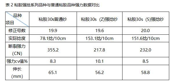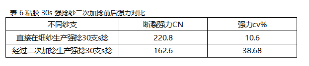以我们摸索生产的粘胶 30s 强捻纱为例,细纱捻度设计为 110 捻/10 cm (捻系数 488),要经过倍捻二次加捻生产成纱捻度 150 捻/10cm,强力对比如下(表 6):