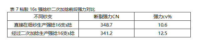以我们摸索生产的粘胶 16 支强捻纱为例,细纱捻度设计为 56 捻/10 cm (捻系数 340),要经过倍捻二次加捻生产成纱捻度 125 捻/10cm,强力对比如下(表 7):