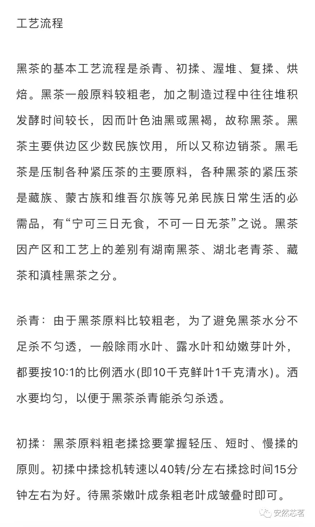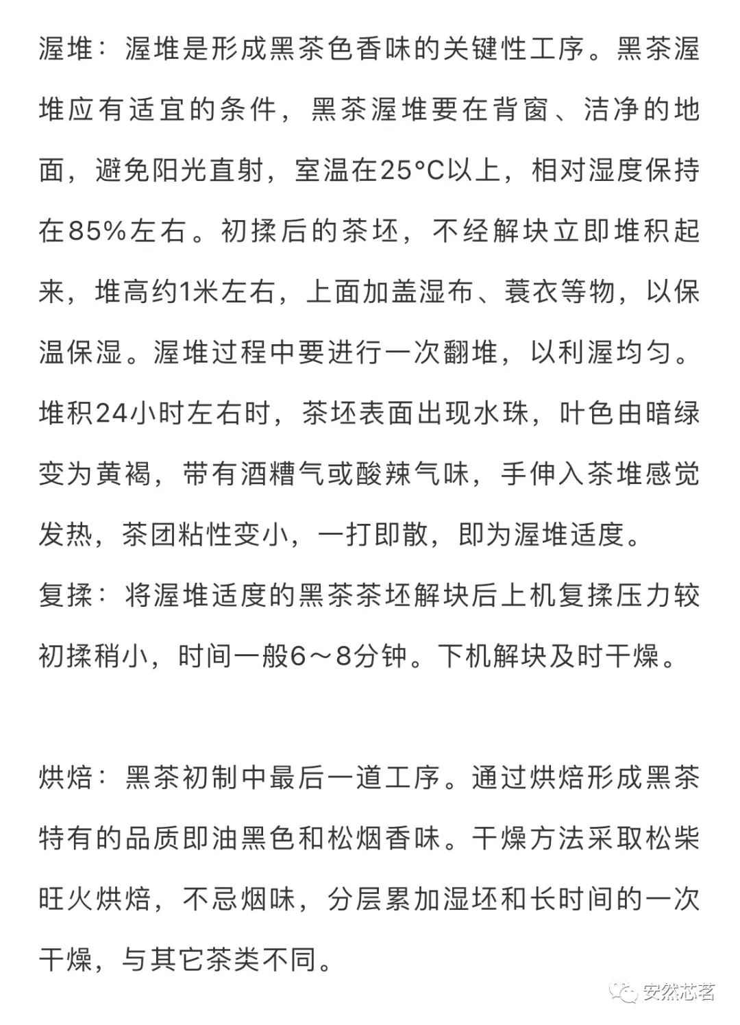 黑茶类的制作过程一般注重发酵或后发酵,有的紧压成砖茶、饼茶和散茶。黑茶一般选用茶壶茶具冲泡,条件准许下可煮茶。投茶——将黑茶大约15g投入如意杯中。如意杯是泡黑茶专用杯,它可以实现茶水分离,更好泡出黑茶。冲泡——按1:40左右的茶水比例沸水冲泡。由于黑茶比较老,所以泡茶时一定要用100摄氏度以上的沸水,才能将黑茶的茶味完全泡出。茶水分离——如果用如意杯冲泡黑茶,直接按杯口按钮,便可实现茶水分离。再将如意杯中的茶水带入茶杯用直接饮用即可,也可直接用如意杯饮用小提示:泡黑茶时不要搅拌黑茶、或压紧黑茶茶叶,这样会使茶水浑浊。