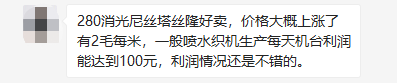 “现在这类面料价格大概上涨了有2毛每米,一般喷水织机生产每天机台利润能达到100元,利润情况还是不错的。”一位纺织老板说道。
