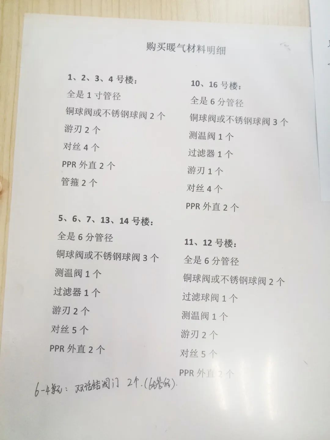 以下是物业给出的各楼需要购买暖气材料的种类和数量明细