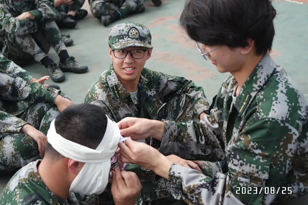 瞧这真诚的目光,学子们坚定的目光随着教官的动作而变动,倾心接受着每一分新知;瞅这迅捷的动作,新生们把平平无奇的布折叠翻转,来堵住汩汩而出的血液;看这协作的精神,两两组成的伤员模拟搬运有条不紊的进行……同学们按序主动完成了医疗实践,模拟过程井然有序,体现了学生们极强的学习和应急能力,更见证了同学们的成长。