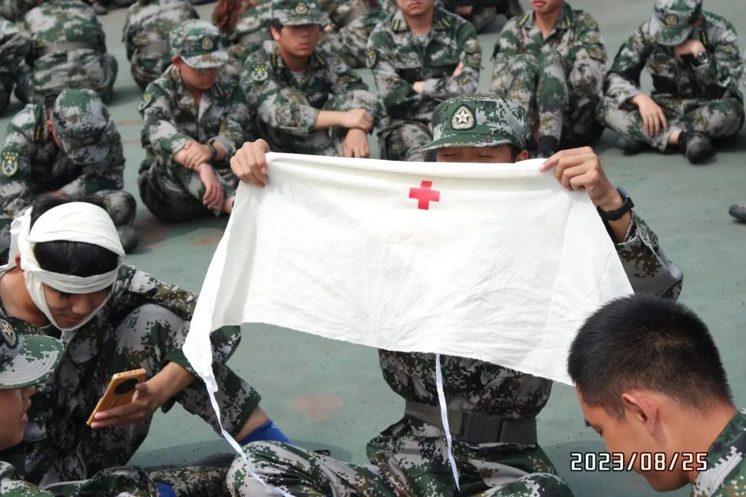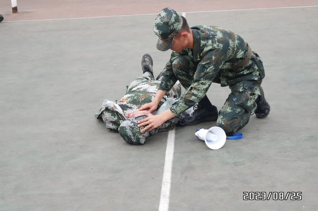 教官们亲身演示,学生们躬行实践:“把手从伤员膝盖底穿过去”,“放松下来别去强迫”,“包扎在这里交叉”……经此番,学生们的知识储备更上一层楼。