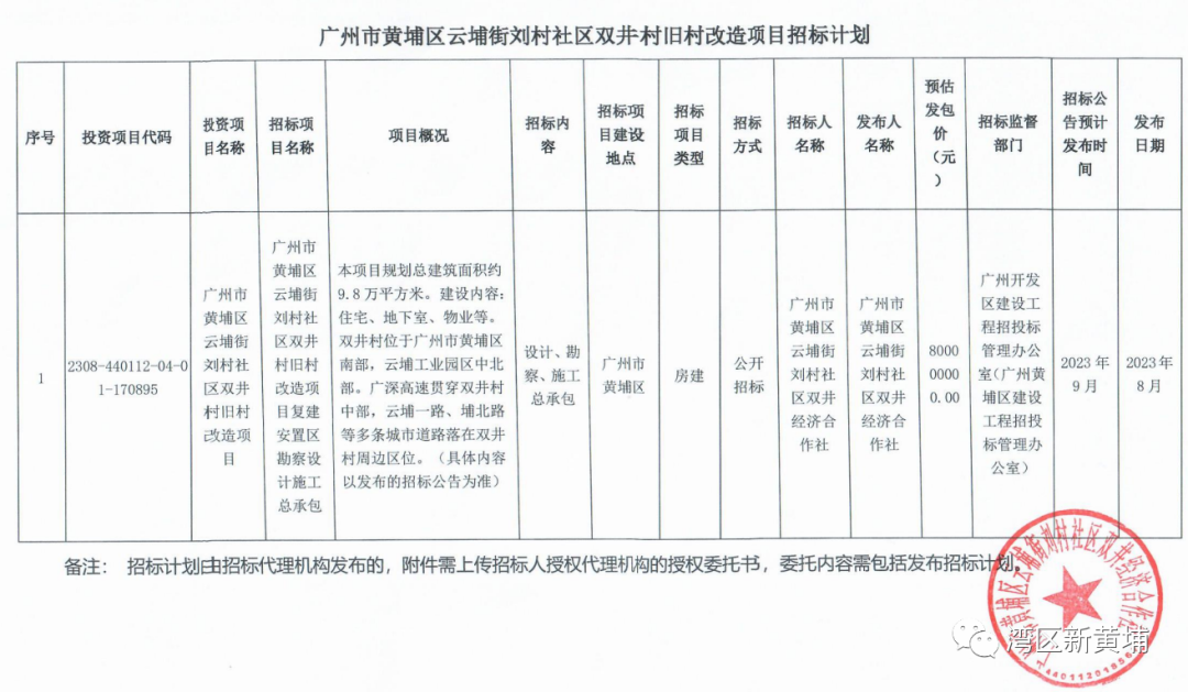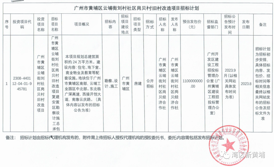 2023年8月28日,黄埔区一口气发布了云埔街刘村社区岗贝村旧村改造项目复建安置区勘察设计施工总承包和云埔街刘村社区双井村旧村改造项目复建安置区勘察设计施工总承包两个项目的招标计划。