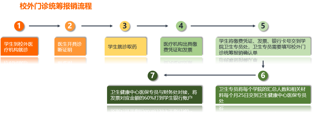 在校外门诊就诊,需学生先垫付所有治疗费用。每月24号由各二级学院卫生专员负责收集材料并汇总后,统一进行报销结算。学生需提供的报销资料有:诊断证明、收费凭证、发票明细、学生银行卡号等。报销比例为单次医疗费用的60%(在医保范围内)。