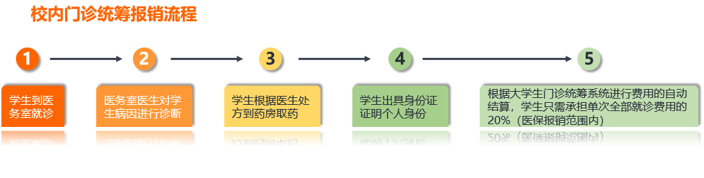 1.“小病不出校,校医能治疗;门诊有医保,省钱又高效”。普通病可以直接在学校医务室就诊,无需垫付资金,直接结算。没有参保的学生在学校医务室就诊,需要全额自费结算。